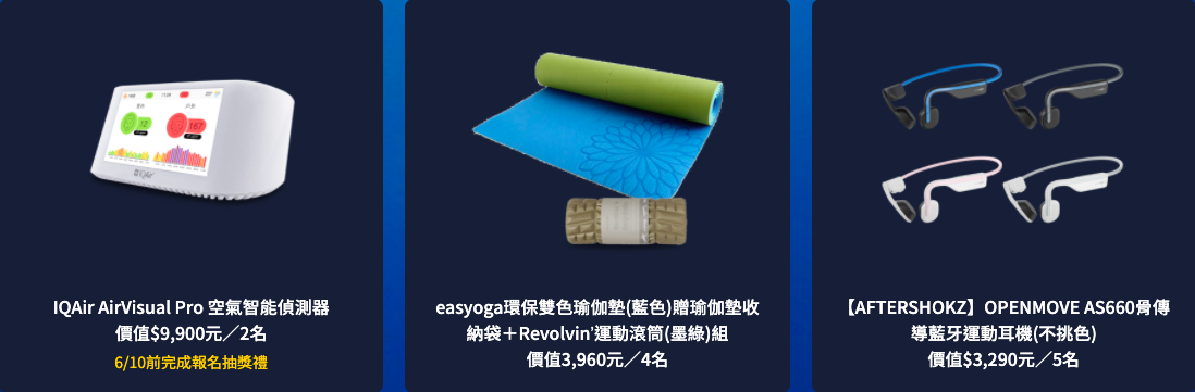 - 於2021年6月10日23:59前完成報名與繳費的跑友,享「IQAir AirVisual Pro 空氣智能偵測器」抽獎資格,得獎名單將於2021年6月17日公布於本活動官網,得獎者於通知後一周內未回覆者視同放棄獲獎資格。