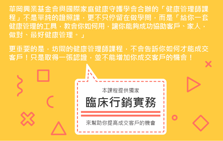 讓一般民眾可以快速的在兩天的課程之中,學習到完整的『健康管理系統』,並且能將健康管理系統應用於自己的家人、朋友、客戶,讓他們的急性健康問題、慢性健康問題、甚至是健康心理層面,都能夠受到照顧,以落實『攜手呵護每個家』的初衷。