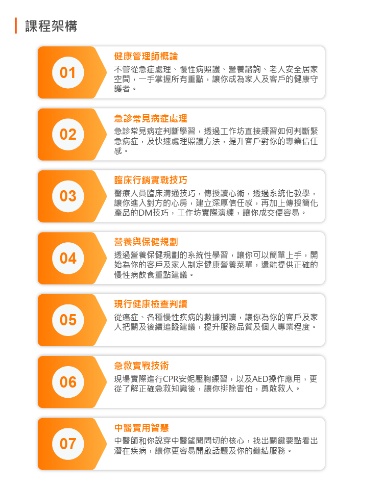 本課程全由第一線臨床醫療人員親自編篡課程,因此對於民眾、亞健康族群的人會遇到的健康問題,我們都會給予關鍵的解決方案。