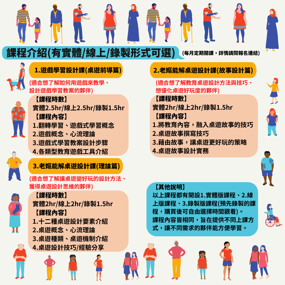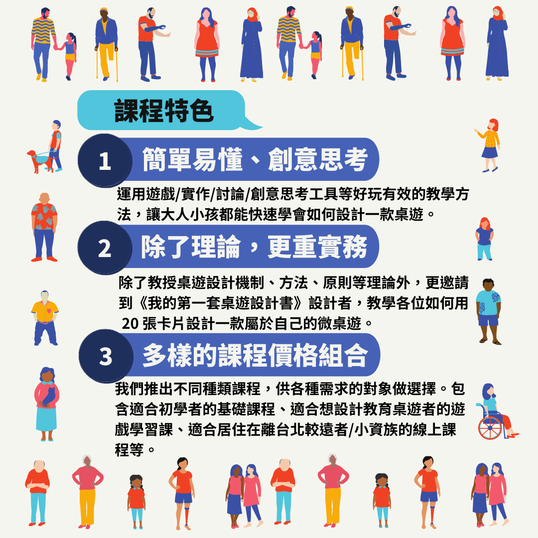 我們推出不同種類課程,供各種需求的對象做選擇。包含適合初學者的基礎課程、適合想設計教育桌遊者的遊戲學習課、適合居住在離台北較遠者/小資族的線上課程等。