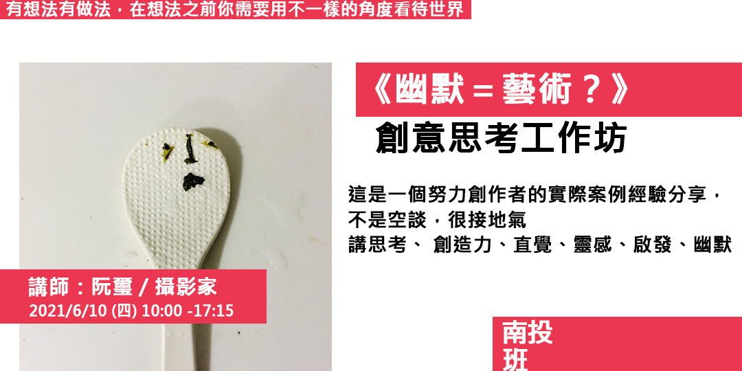 創意如何培養?幽默是天生的嗎?任何工作都需要一些浪漫成分,才能讓你顯現與眾不同,創造不同價值,本次工作坊,阮璽將透過自己與經典世界大師的藝術作品、展覽、出版物、案例講思考、 創造力、直覺、靈感、啟發、幽默。如果你很喜歡攝影或是各類藝術,或是想了解創意思考,甚至想當一個攝影家或藝術家 這個工作坊都很適合你。這是一個努力創作者的實際案例經驗分享,不是空談,很接地氣。讓我們用非傳統的思維與創意,重新解讀環境,創造自己。