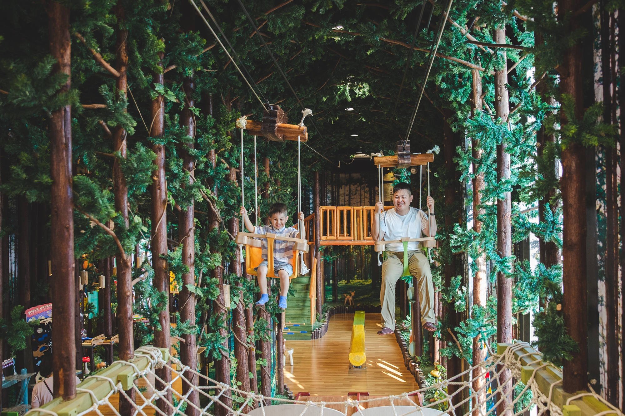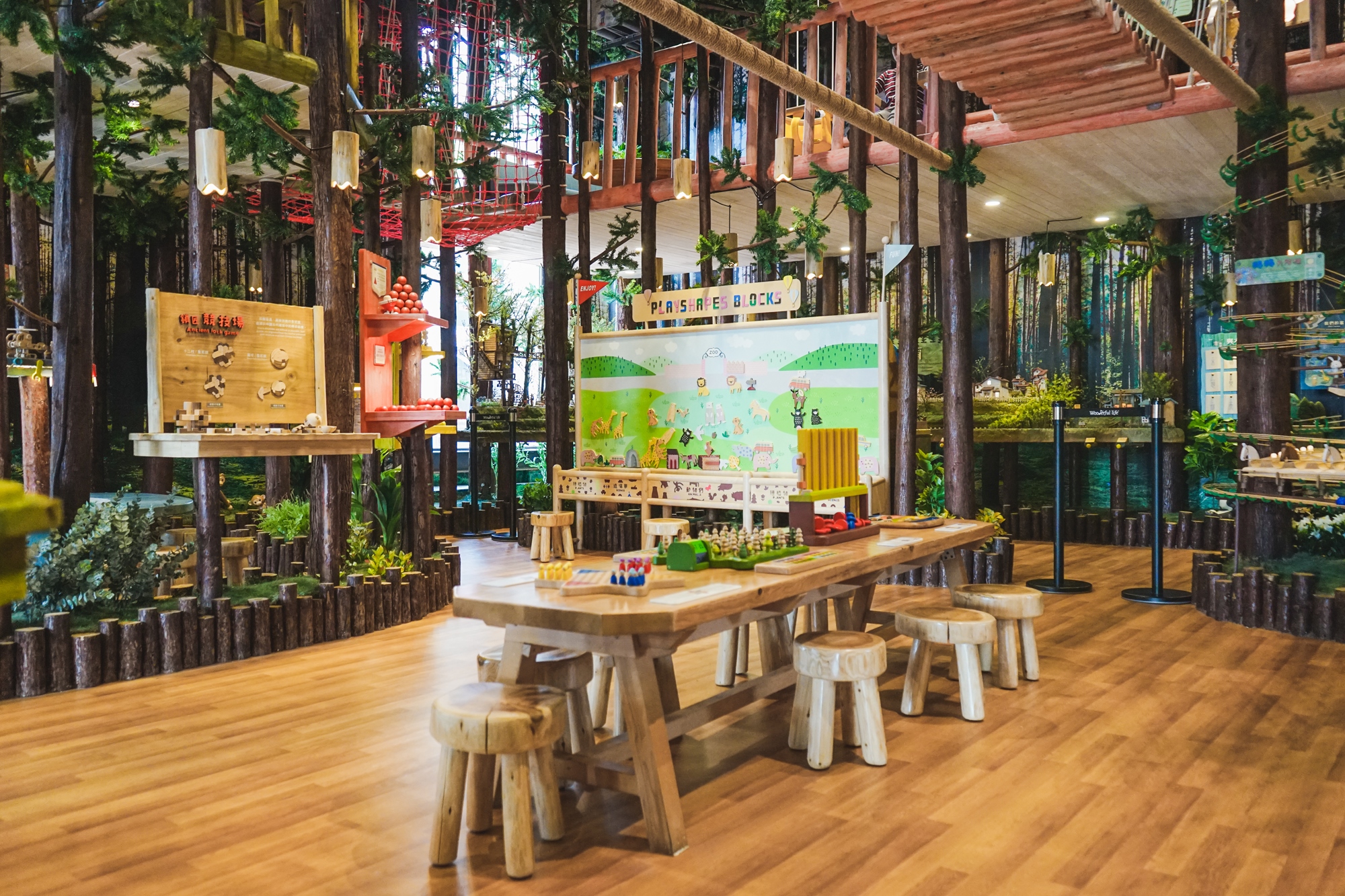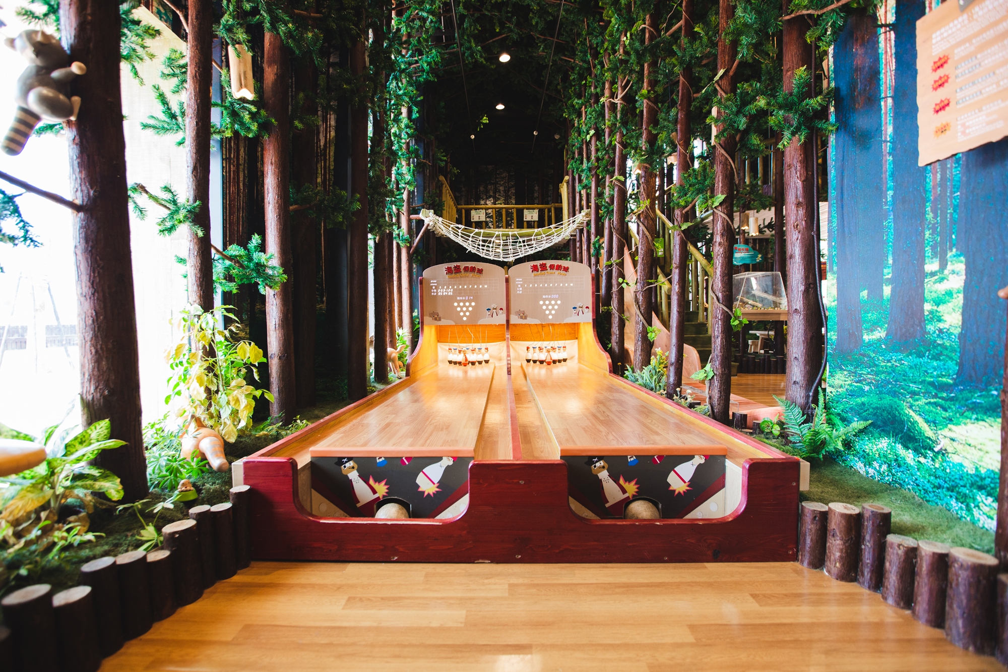 從桌上型益智遊戲延伸至五感體驗的大型遊憩空間,受到許多人歡迎的「空中飛人」、「砲擊怪小人」、「海盜保齡球」等設施,都可以在木育森林中盡情體驗。