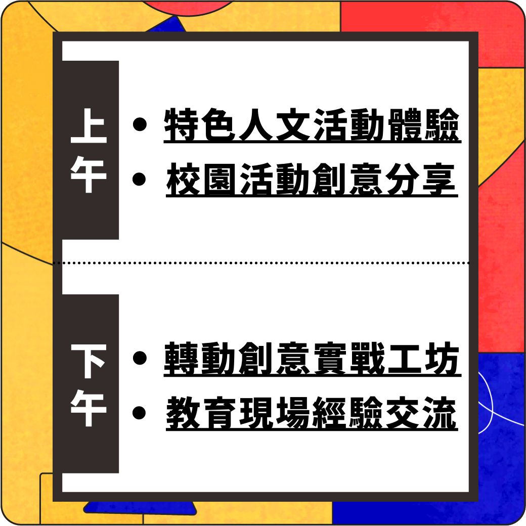 千萬別錯過這場工作坊,讓我們透過各式想法激盪、教案實作,創造出讓參與的師生、家長心裡感動、彼此互動且更有別樣意義的校園活動吧!