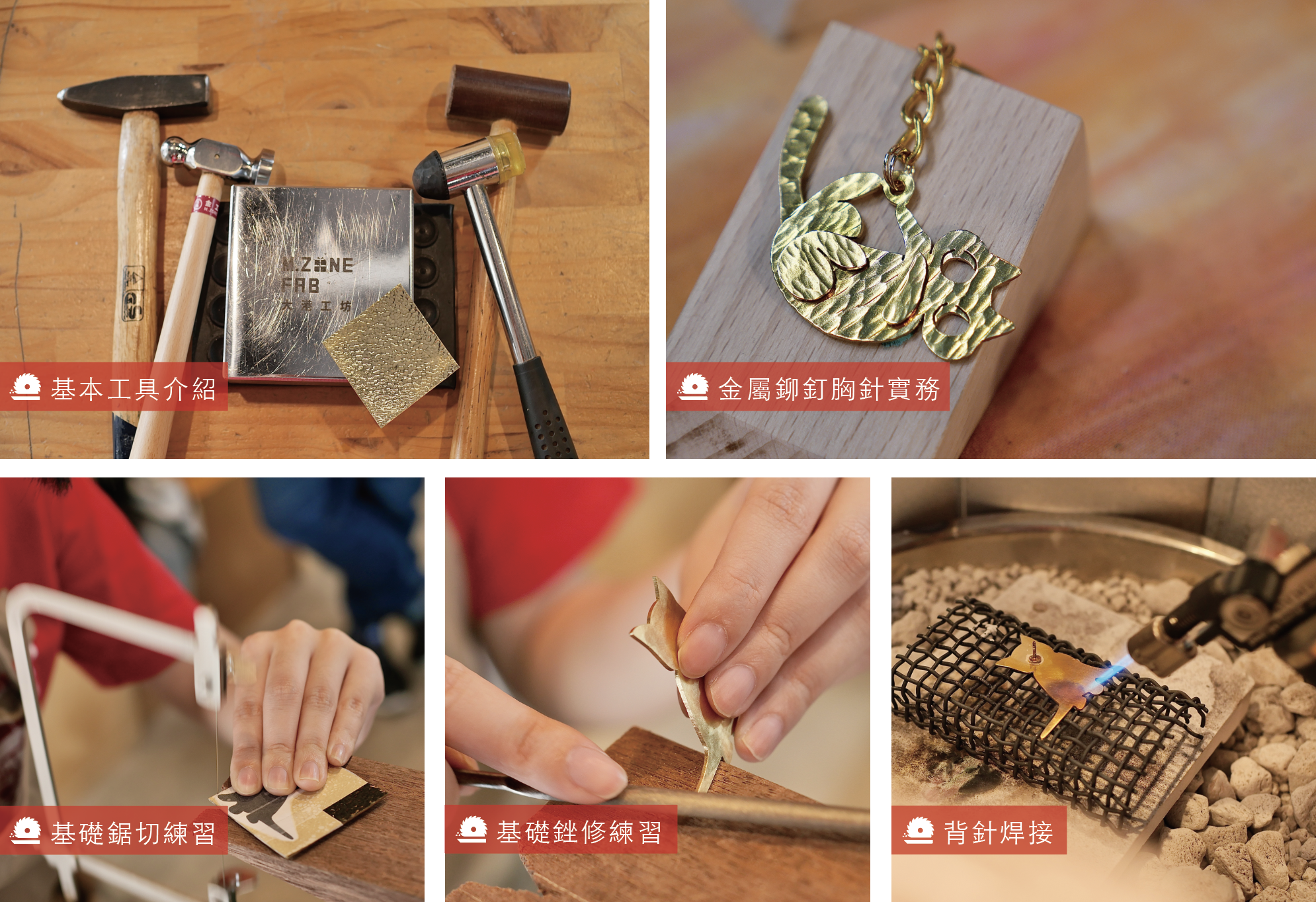 在四堂共14⼩時的課程中,講師將藉由各項專業的金工機具,帶領學員學習「鋸、銼、敲、拋、焊」等基礎金工技法,製作屬於自己特色的雙作品(墜飾/胸針),體驗金工創作的樂趣!