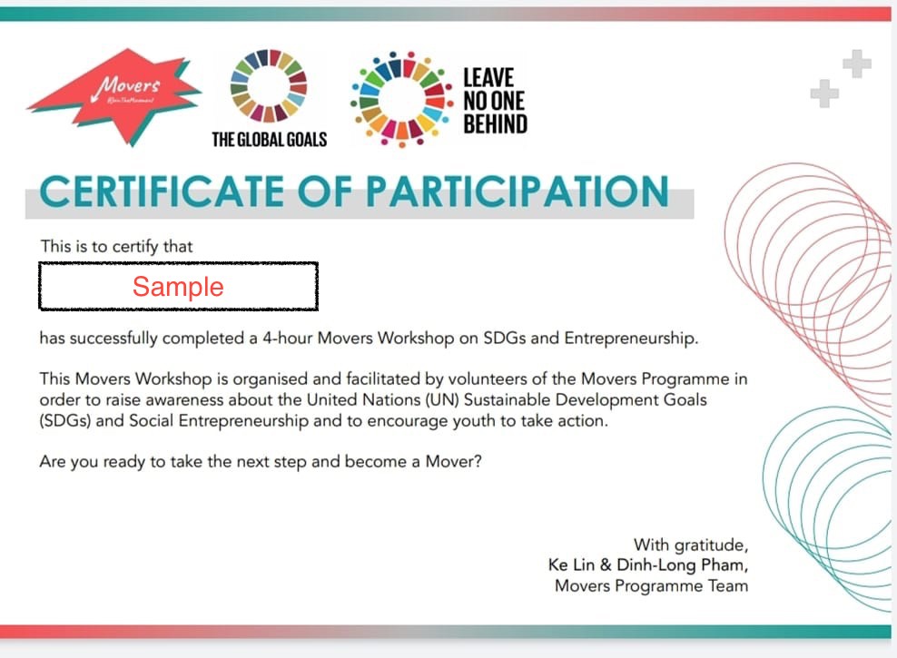 此工作坊將傳達專業與最新的氣候變遷知識,參與者在工作坊後,將取得Movers Programme署名的工作坊電子證書(範本如下圖),並有機會於未來Movers Camp及其他聯合國相關活動優先錄取機會,甚至於未來有機會成為Movers協作人和Movers行動者。