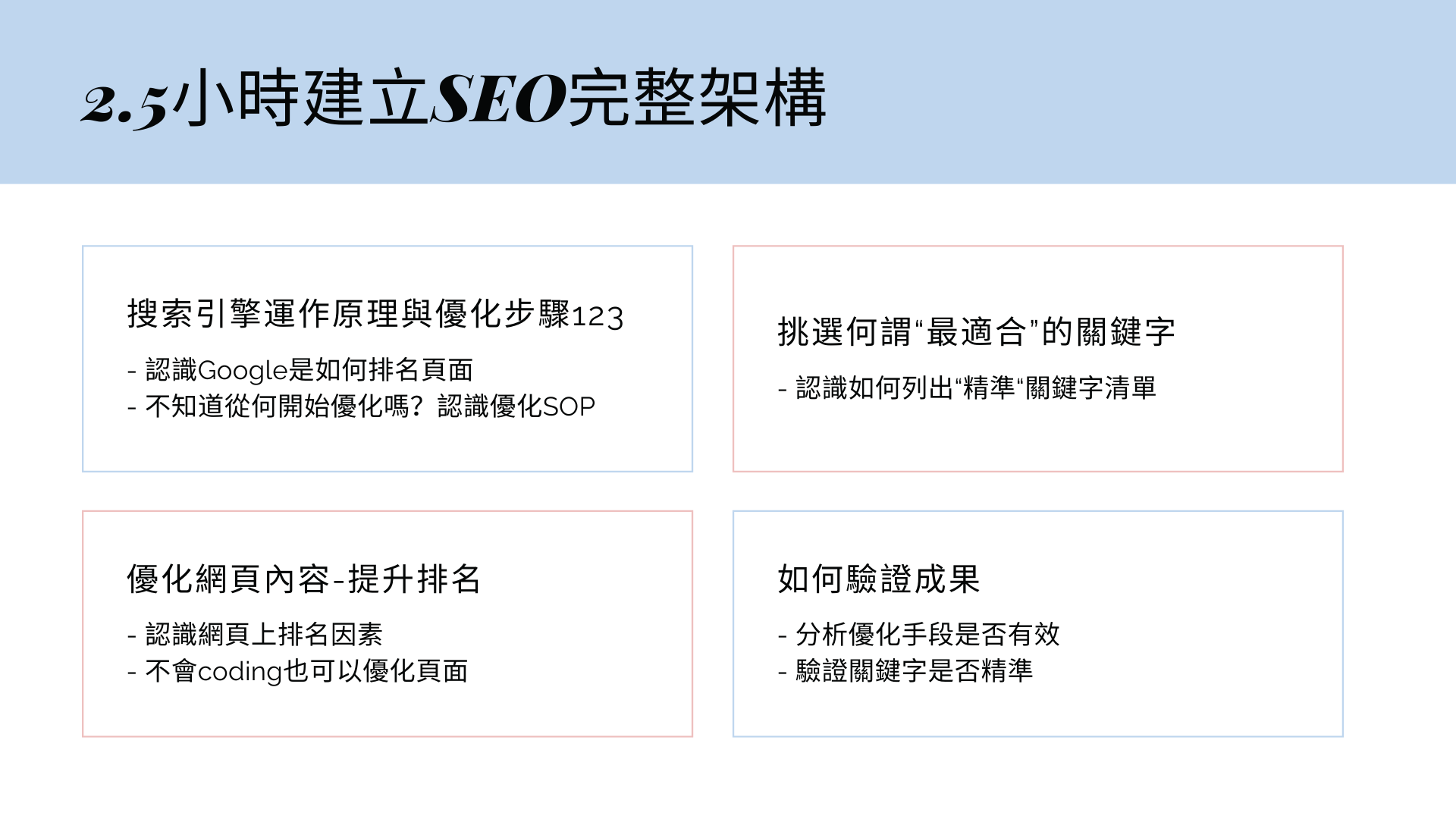 我們常聽到關鍵字、搜尋引擎優化,這些專有名詞似乎很熟悉,卻又不太知道如何使用。這堂課會以初學者的角度出發,結合講師在職場上的實戰經驗,帶你一步一步建立SEO的完整架構,並藉由SEO提升你的搜尋引擎排名,進而直接影響自然流量。