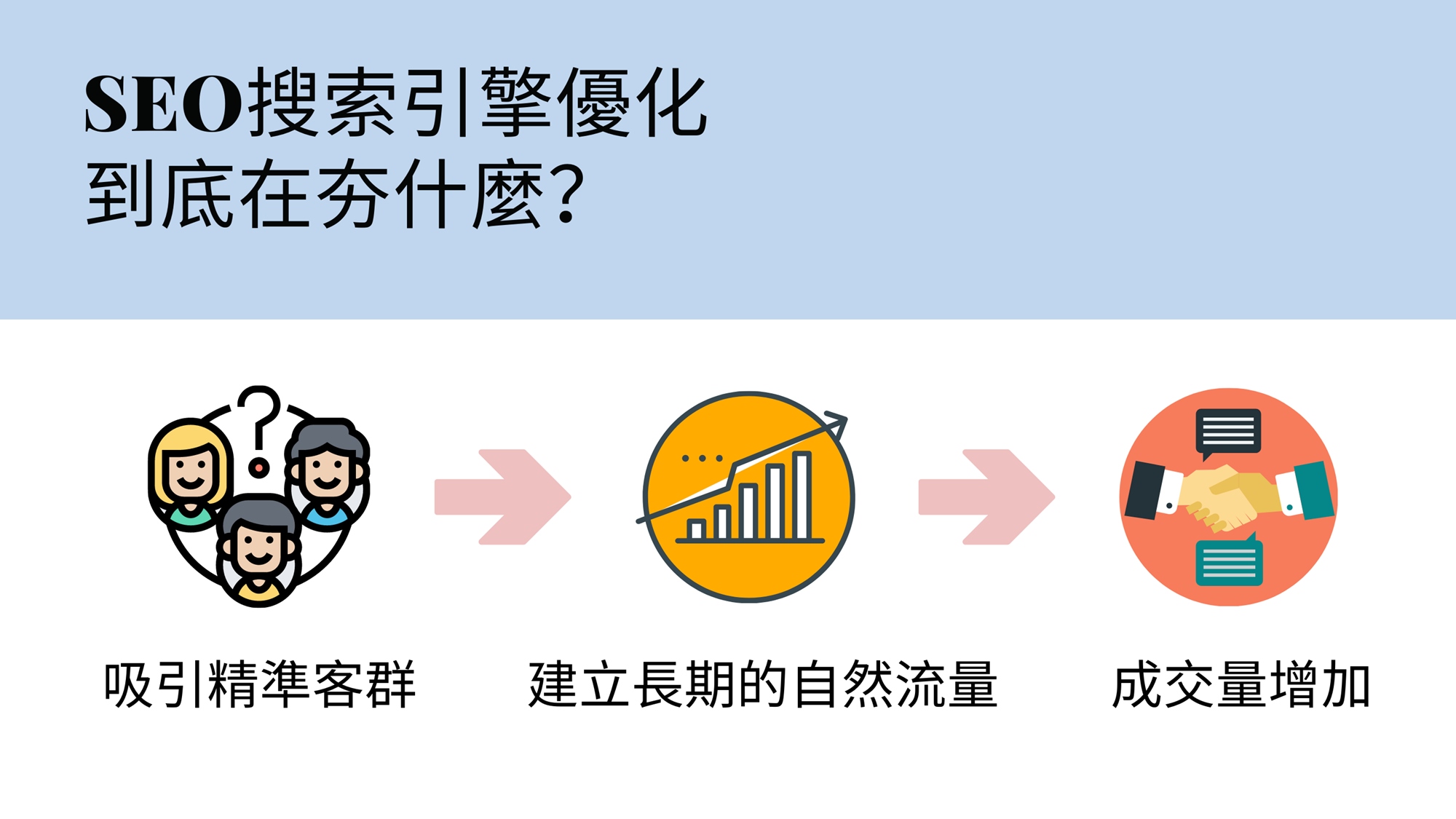 SEO是一個完善網頁的過程,使搜索引擎能讀懂並儲存網站重要資訊,進而讓潛在顧客在搜尋相關關鍵字時能在第一頁看到您的網頁。