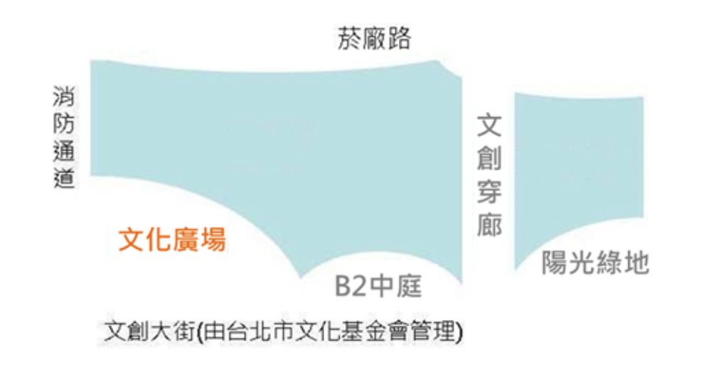台北:於臺北文創大樓戶外場域(橘字區域)「文化廣場」,約佔地約 350 坪,選擇廣場合適範圍進行規劃。