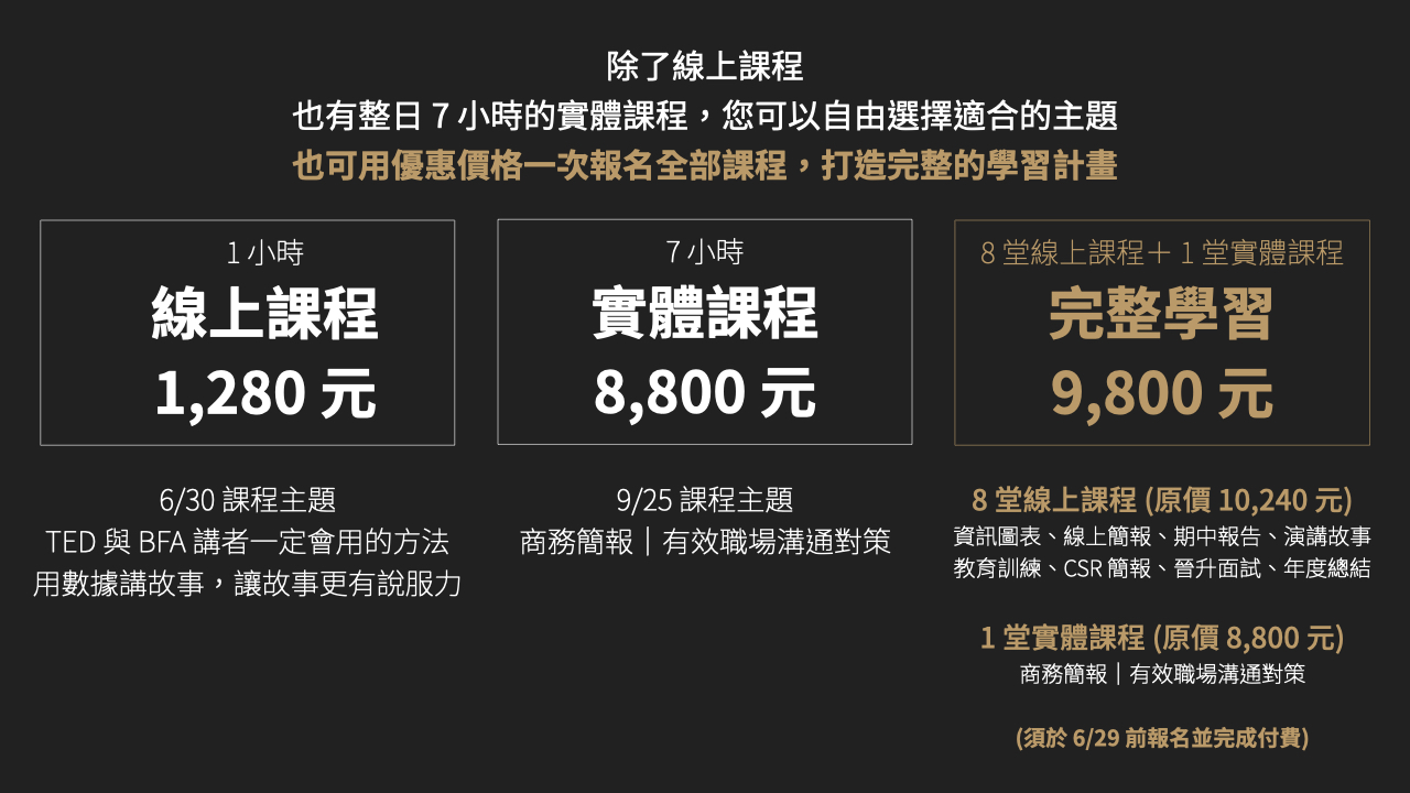 即日起至 6 / 29,您可以用優惠價格一次擁有全部課程,包含全年度 8 堂線上課程,再加贈一堂 7 小時的實體課程,為您打造完整的學習計畫 ! 線上課程可無限回放,在任何時間都能完整學習。