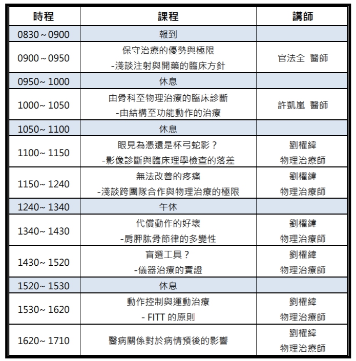 本課程特別邀請到成功大學醫學院骨科部 官法全醫師,分享『保守治療的優勢與極限-淺談注射與開藥的臨床方針』,分析保守治療的優缺點與應用原則;成功大學附設醫院骨科部許凱嵐醫師,分享『由骨科至物理治療的臨床診斷-由結構至功能動作的治療』,如何從臨床診斷分析轉介物理治療,以達到最好療效。本課程同時邀請成大醫院物理治療中心劉櫂緯物理治療師,由多面向分享肩關節評估與治療,包含臨床理學檢查、治療實證、動作控制與訓練、甚至跨團隊合作與醫病關係等。