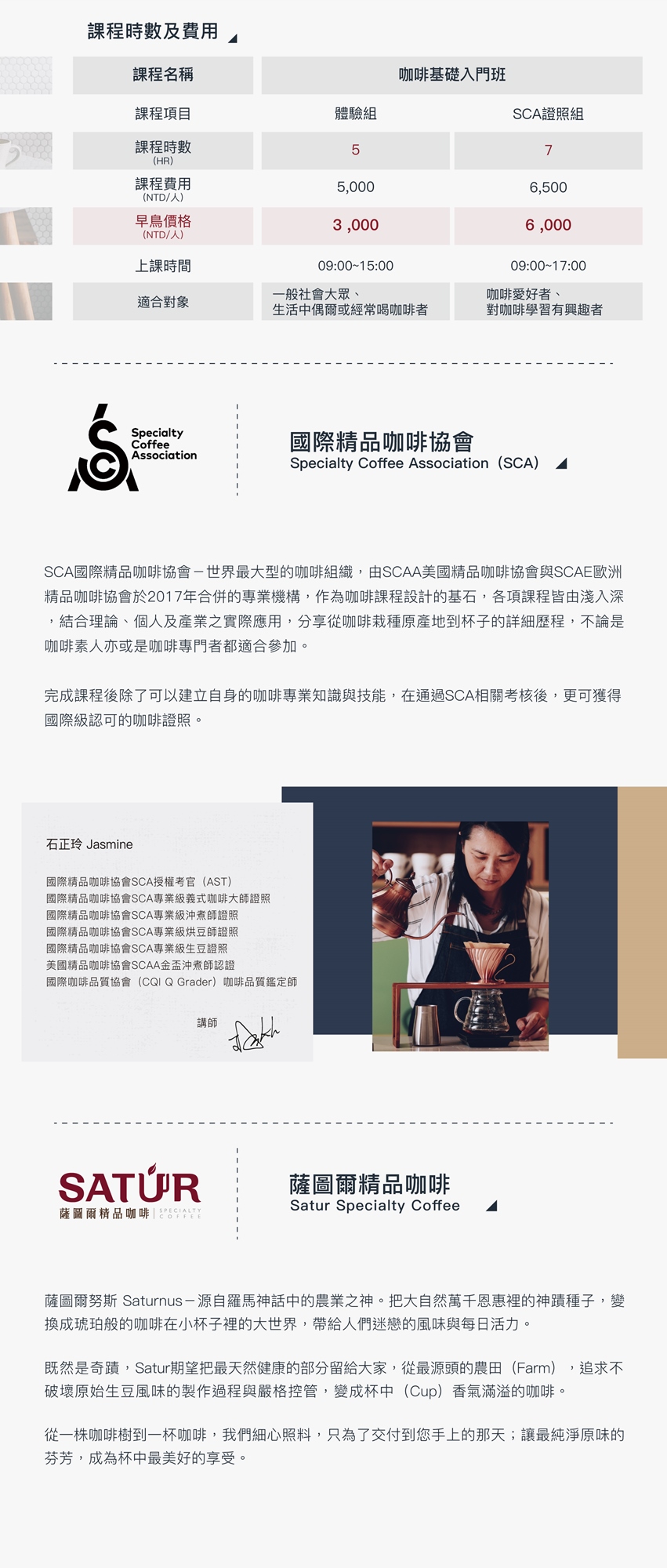 2. SCA證照組收費已包含考試與證照費用,課程後學員需進行線上筆試,成績合格將取得SCA認證之咖啡基礎入門證照。