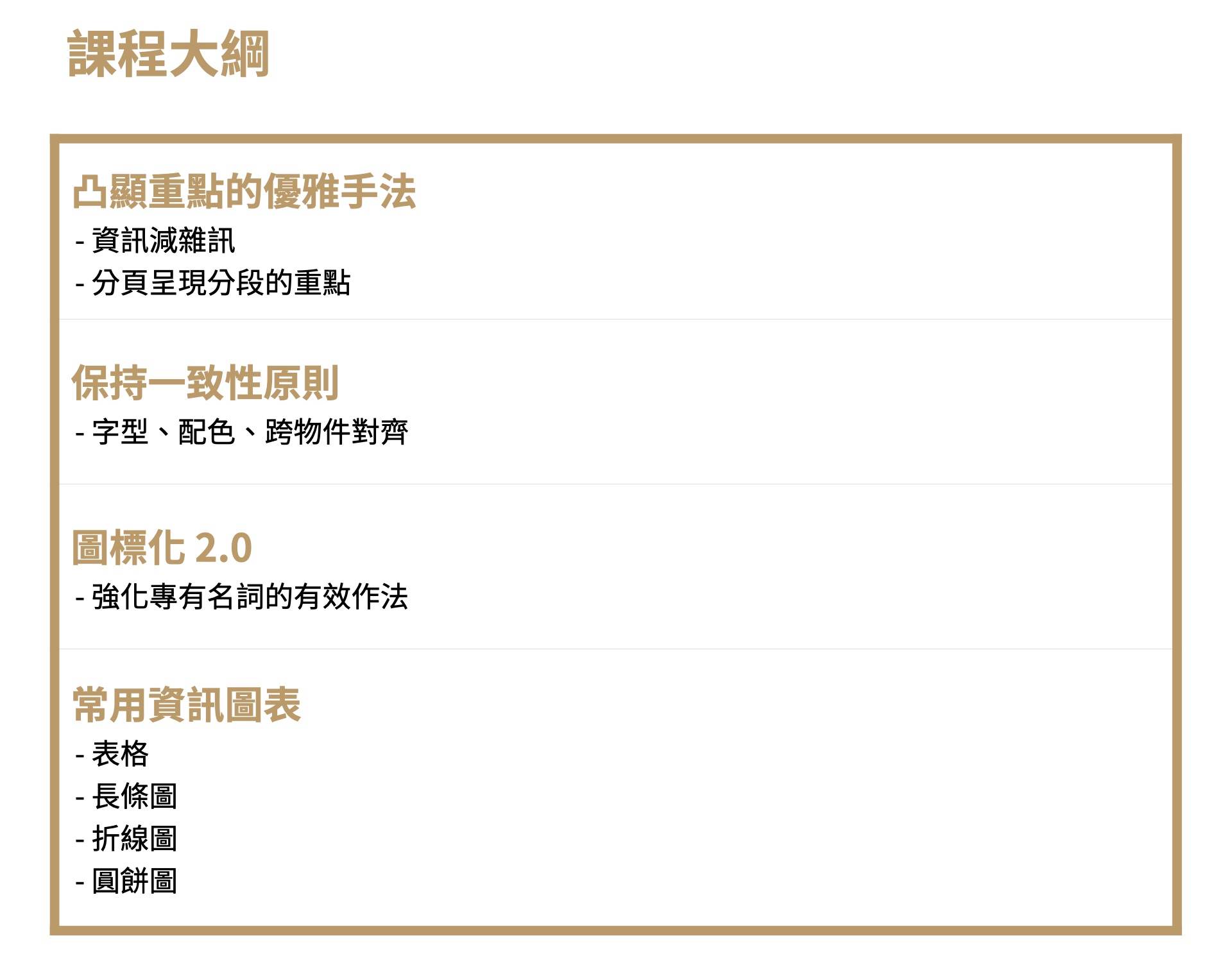 這是一門 90 分鐘的直播課程,授課重點會聚焦在立即可以上手的簡報製作技巧,讓龐雜的資料跟內文能被輕鬆處理、清晰呈現。講師也會透過常見的資訊圖表案例分析,讓數據跟圖表能傳遞真正有價值的商業信息。
