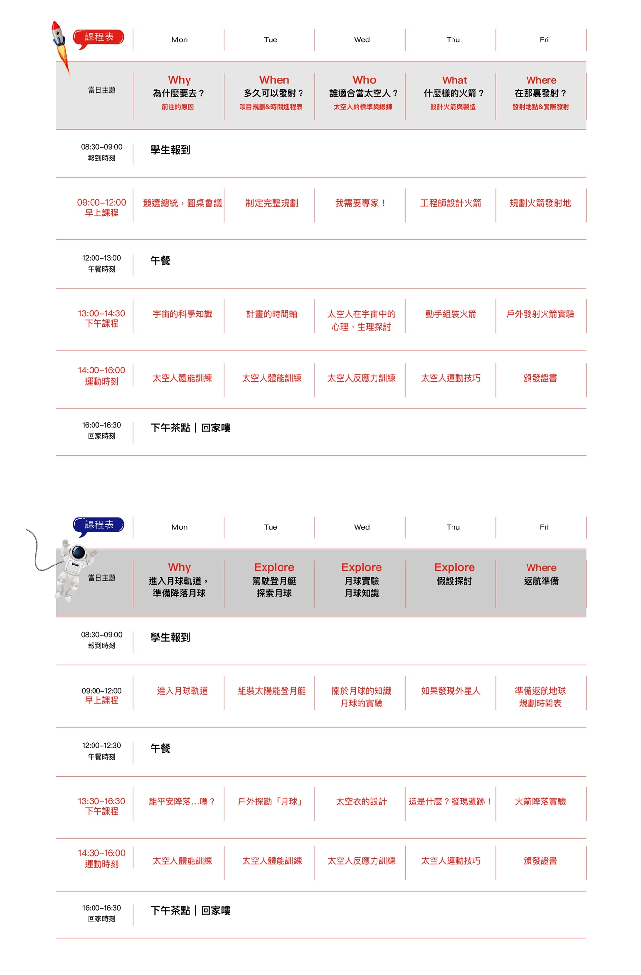 - 人文探討:化身計畫中的核心人物進行思考討論,發表意見 • 計畫規劃:制定登月計劃的各項時間表 •