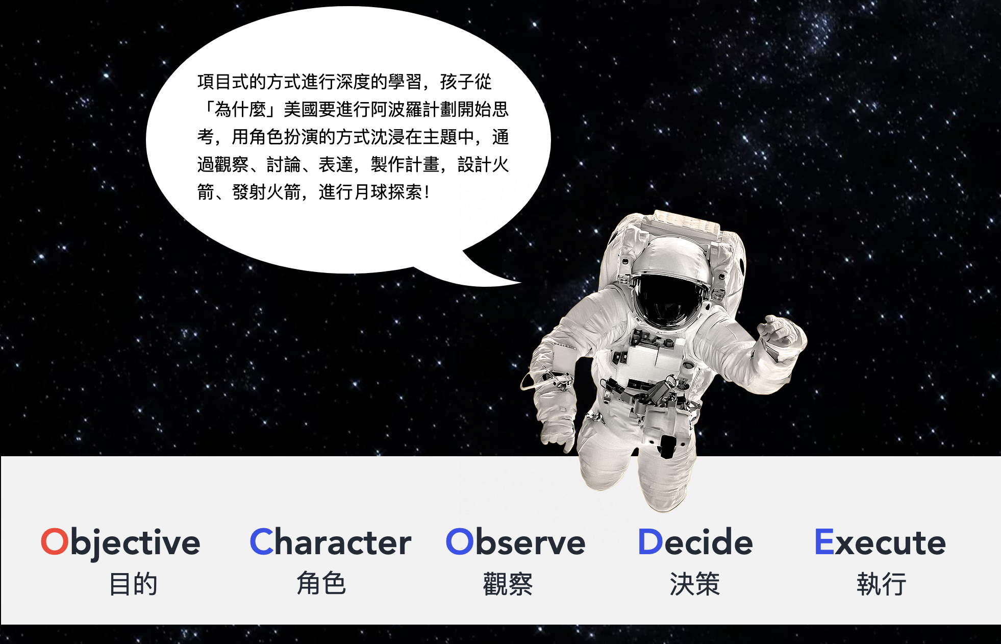項目式的方式進行深度的學習,孩子從「為什麼」美國要進行阿波羅計劃開始思考,用角色扮演的方式沈浸在主題中,通過觀察、討論、表達,製作計畫,設計火箭、發射火箭,進行月球探索!