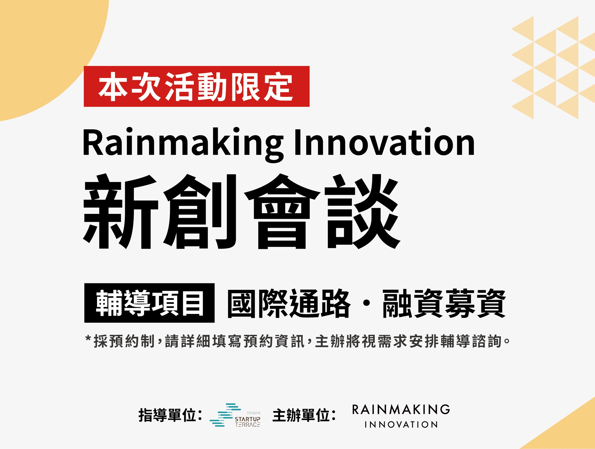 Rainmaking Innovation 是國際企業創新與策略發展領導品牌,致力於輔導全球創新創業和加速財富世界 500 強企業發展的國際平台。我們提供新創企業全面性的策略輔導及有效資源,其中包括策略規劃、商業模式、資金規劃、業務拓展及海外業務對接等,協助新創企業發揮所長,迅速拓展市場。Rainmaking Innovation 在台灣專注於金融科技、智慧城市、數位醫療與智慧製造四個垂直產業,在台北、林口、台南、高雄均有據點。