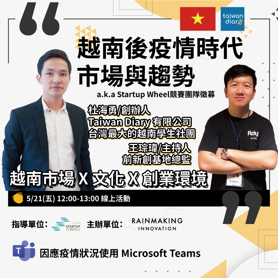 越南北鄰中國,西接柬埔寨和寮國,擁有超過9,600萬人口,位居世界第15名,經濟成長率超過 6.5%,是東南亞成長率高的經濟體之一,新創產業也正在萌芽!這次線上直播活動邀請 台灣最大的越南學生社團 杜海勇 (Taiwan Diary/創辦人) 來線上聊聊越南後疫情時代市場趨勢,從越南市場、越南文化及創業環境。另外,本次也會提到2021年由越南所舉辦創業競賽Startup Wheel是目前越南最大及最負盛名的新創大賽,敬邀大家一同參與這個比賽