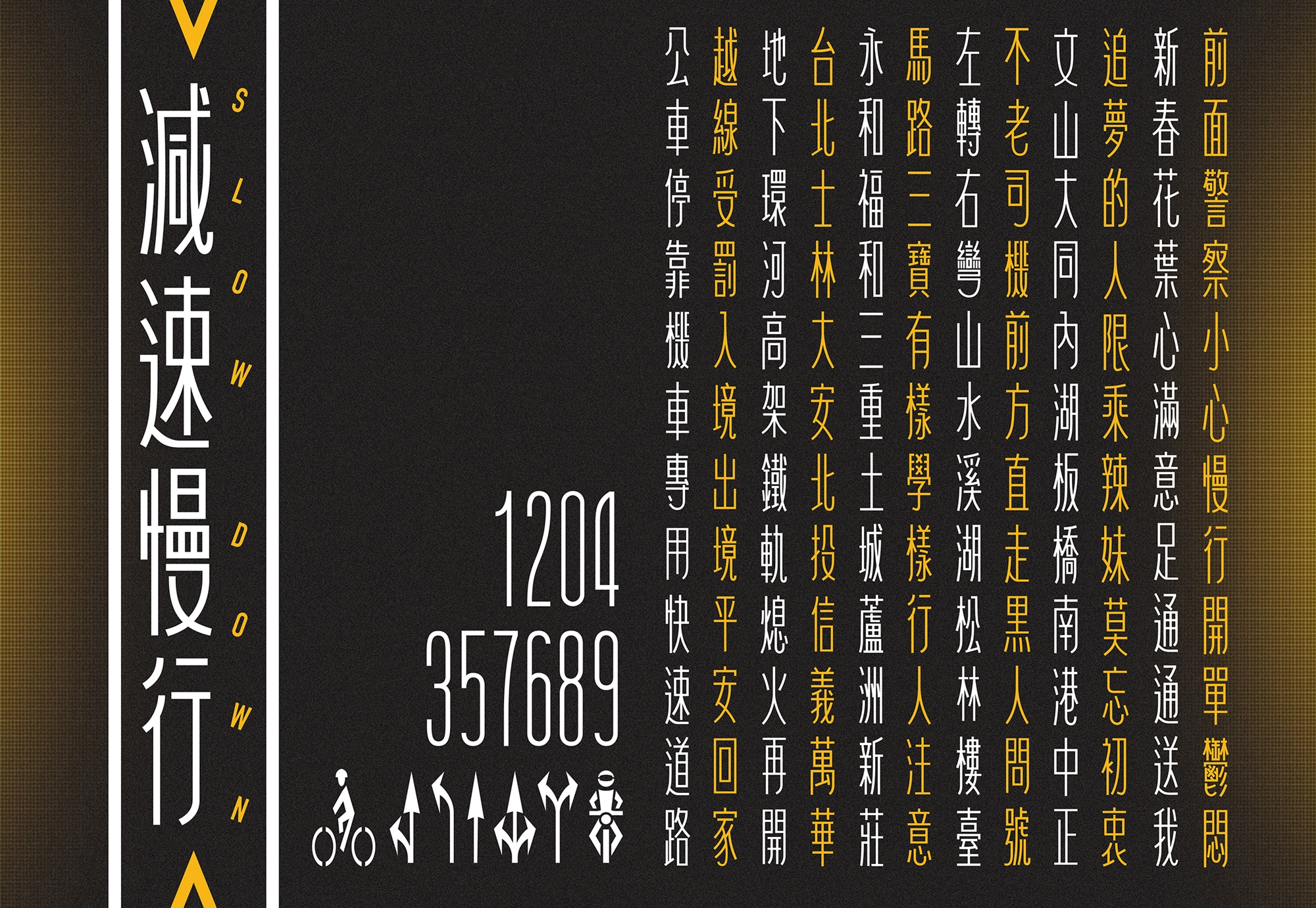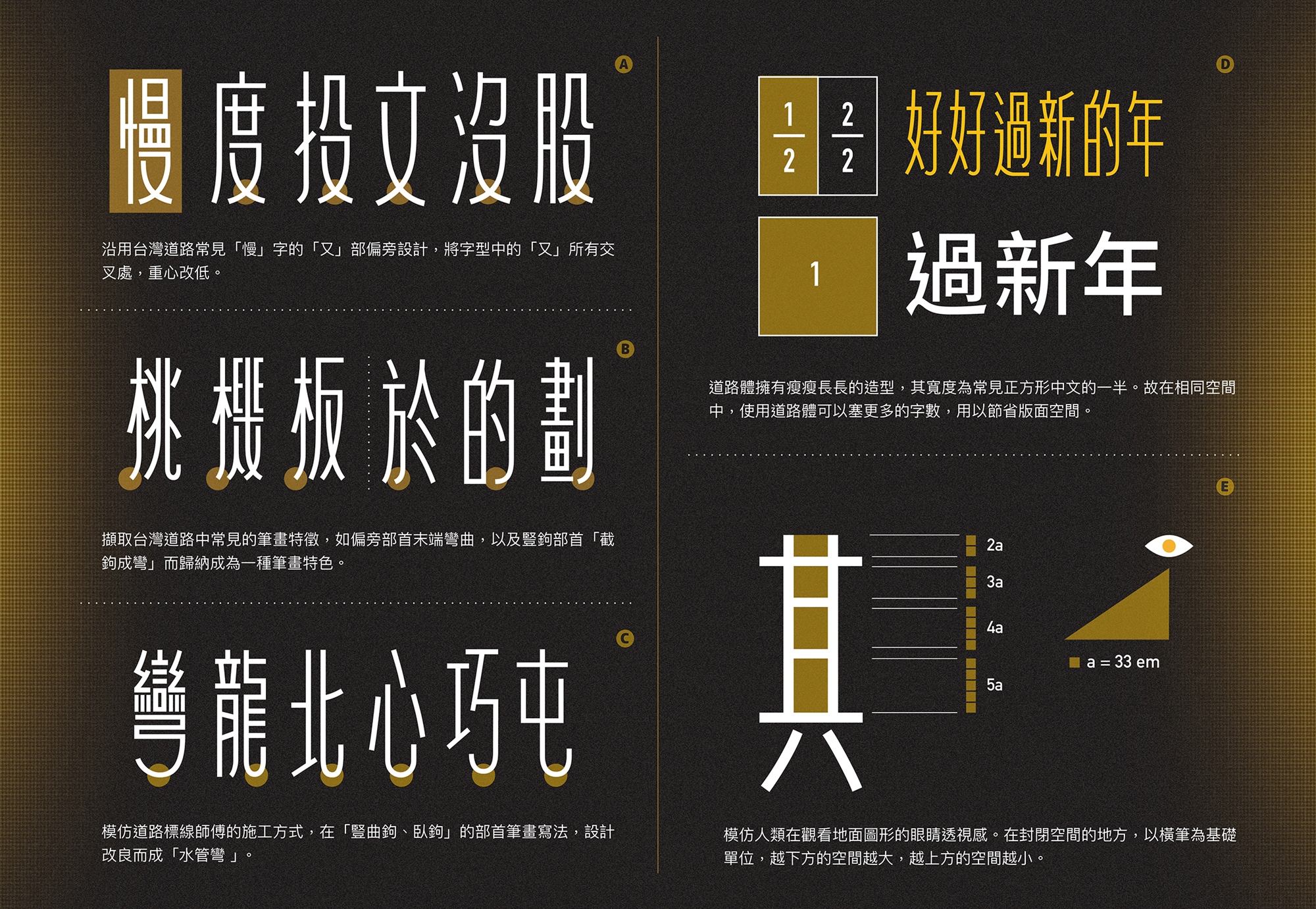 發想自台灣馬路特有的交通指示字型。道路體瘦高且長,筆畫最特殊之處是某些部首尾端的些微彎曲,給人從容行走的優雅感,適用於輕鬆的戶外活動、政府機關、人文地理等中性主題。聽說最近(終於)要完成了,這次小聚(咩逼)還會交代後續,敬請期待!