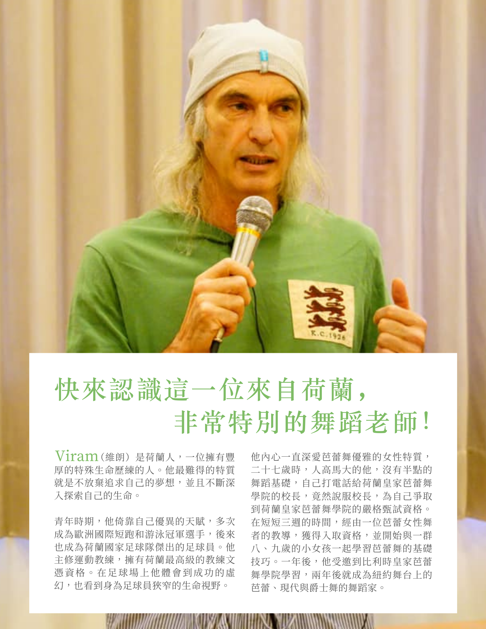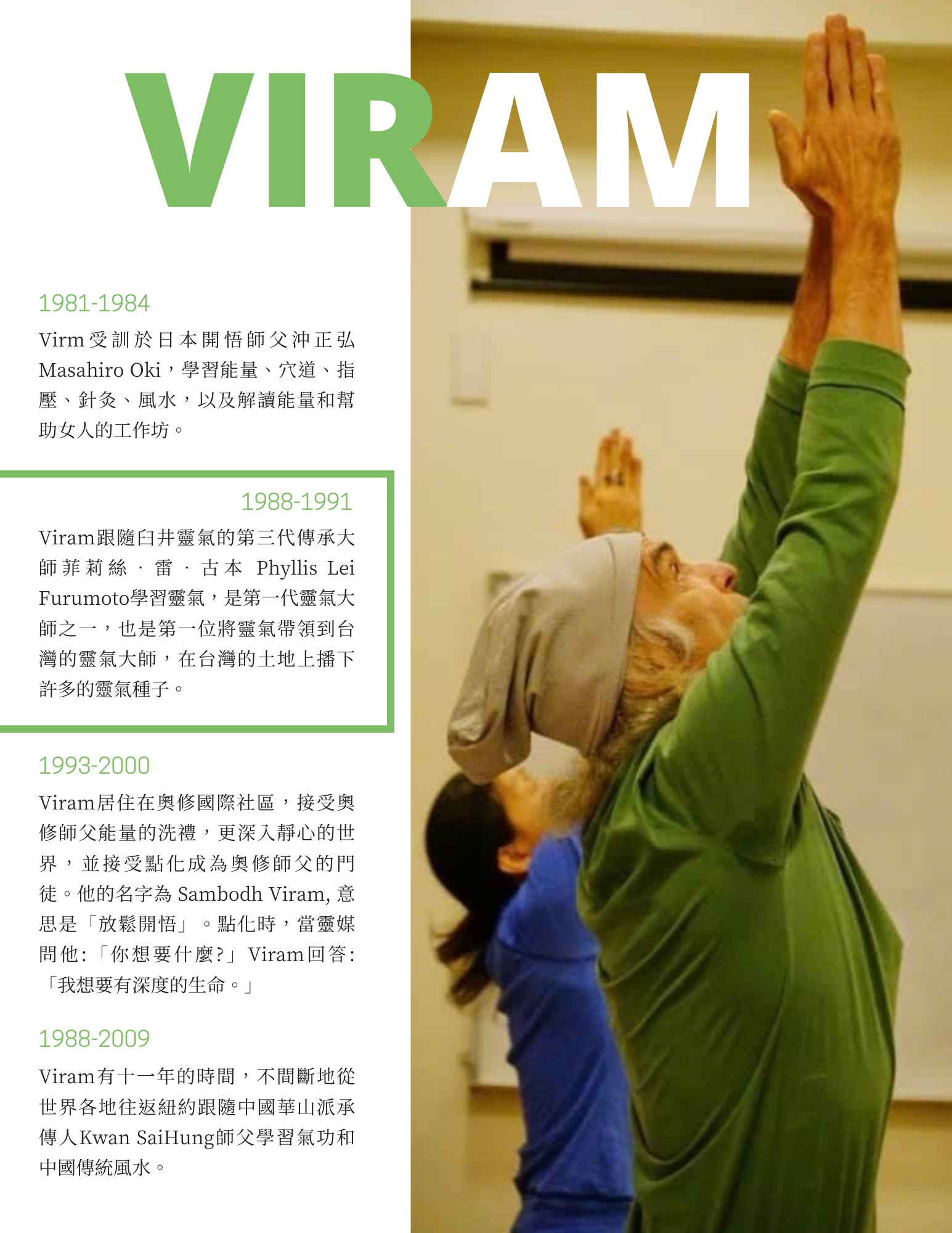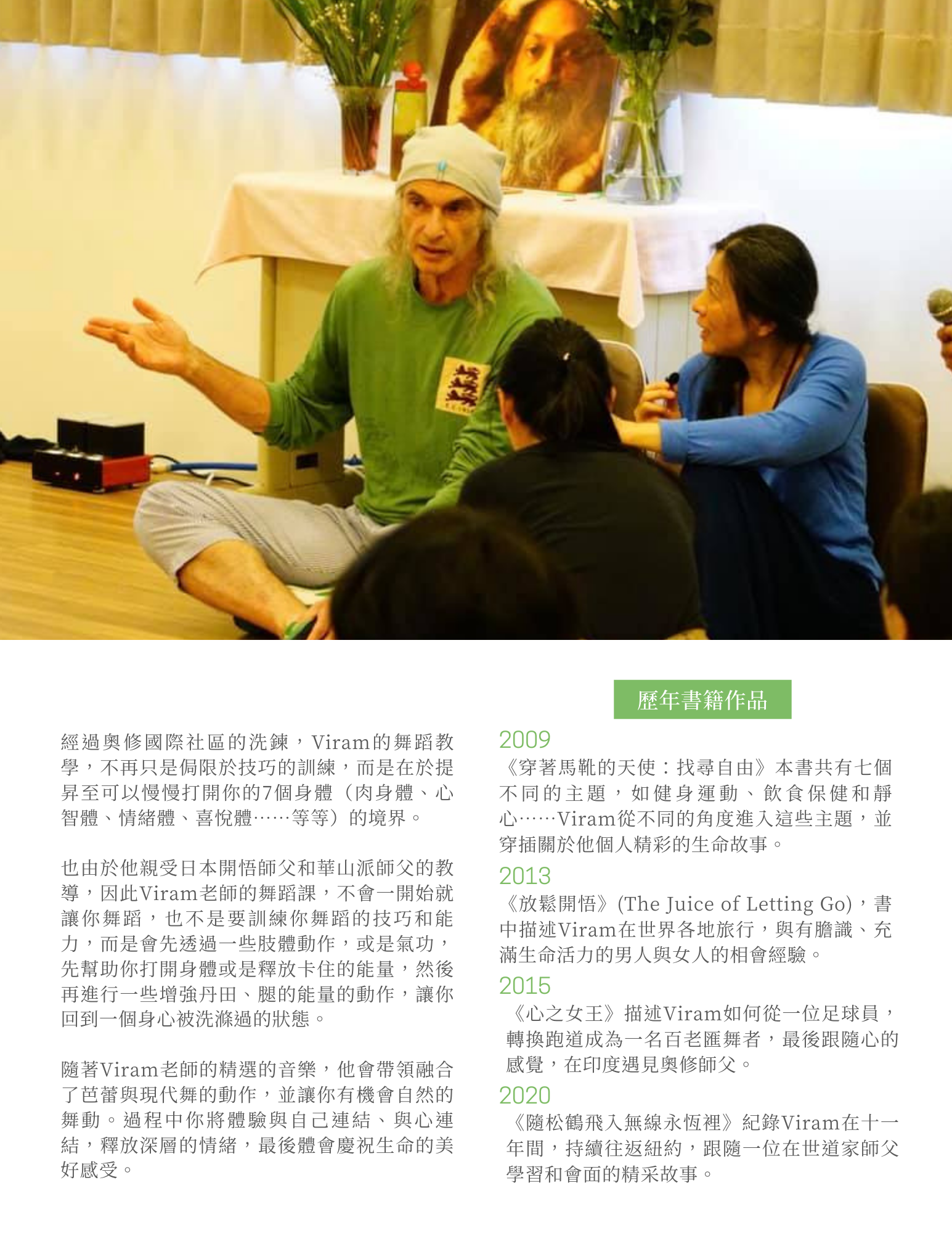 Viram老師在帶領舞蹈的時候,重點不在於訓練你的舞蹈技巧和能力, 而是讓你有機會在短暫的片刻裡,返回到純淨的靈魂狀態。讓你活出自己,活出超越形式、超越身體、超越時間的你!