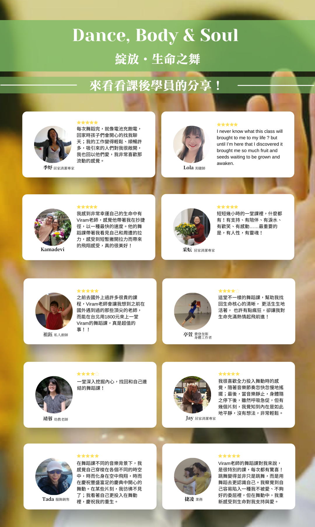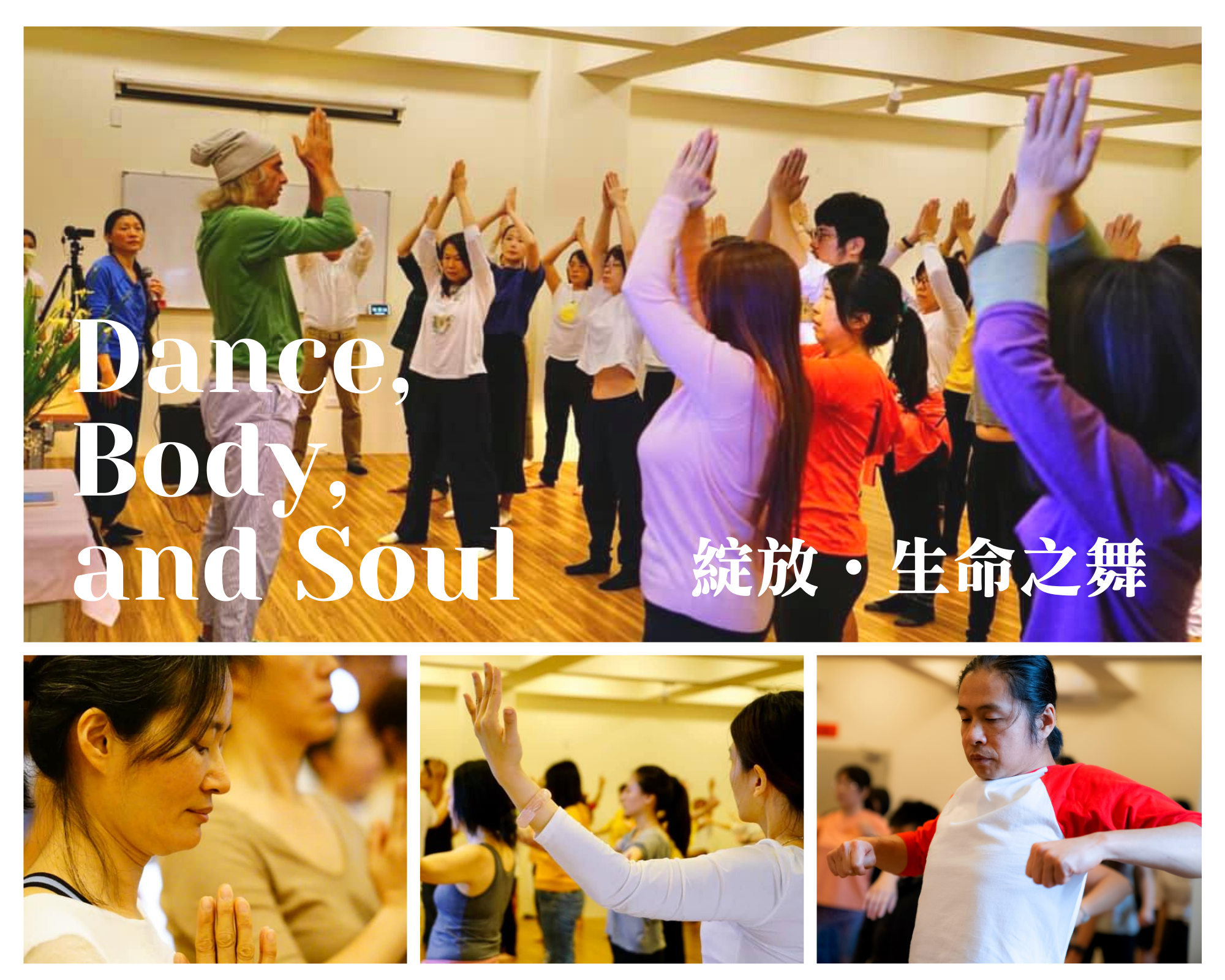 在《Dance, Body & Soul: 綻放.生命之舞》的課程中,我們不只是舞蹈,更多的是創造啟發。你會感受到,「你」是一切的核心,「你」才是生命的主角。很多學生在課前與課後,都體驗得到內在的轉變與喜悅!