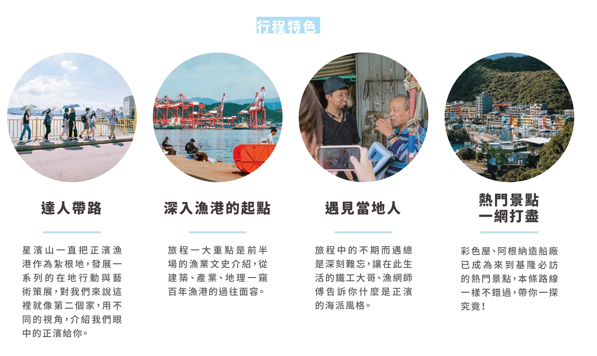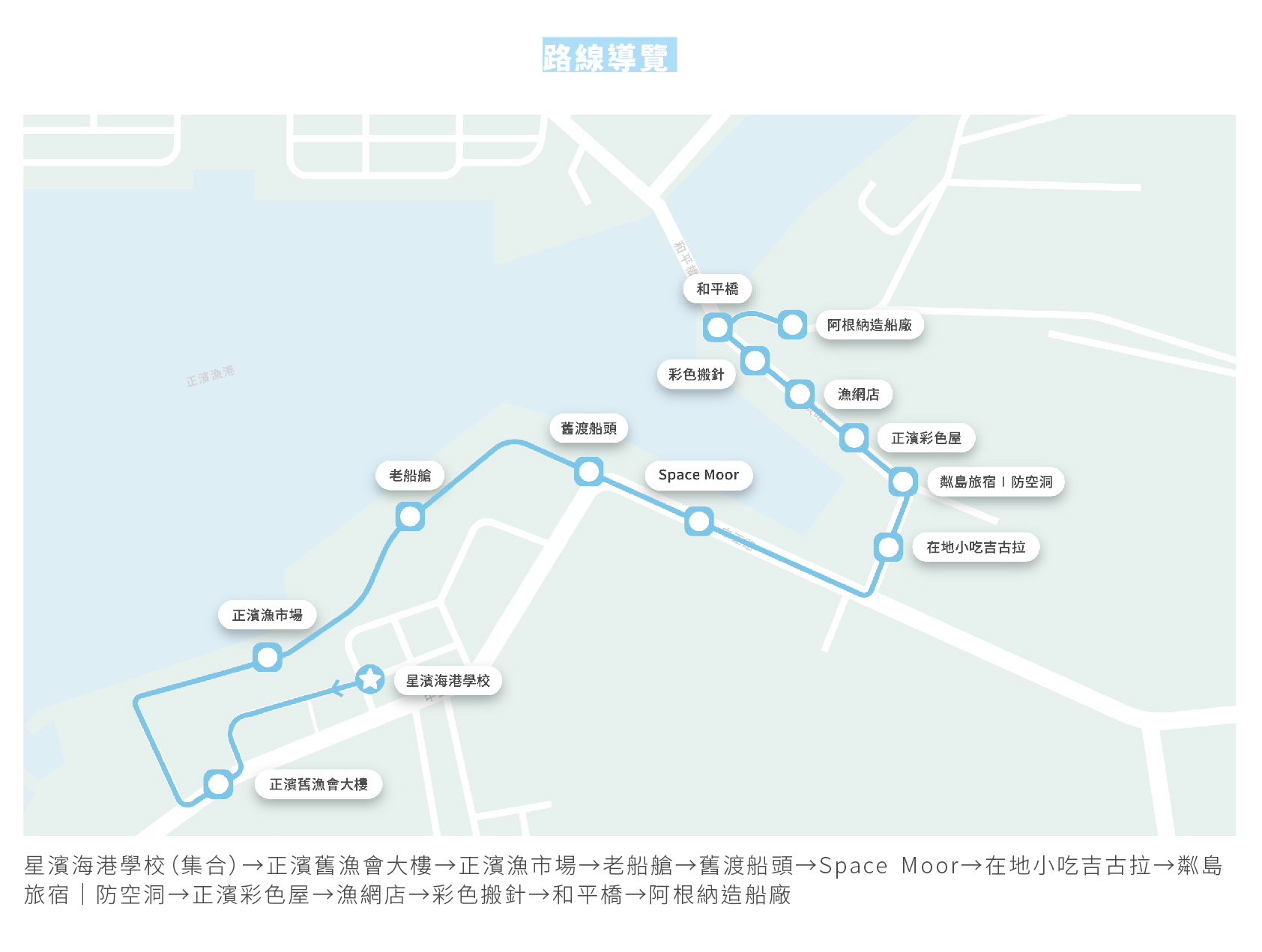 正濱漁港是北台灣第一個現代化漁港、台灣第一個遠洋漁業漁港,更是日治時期金瓜石礦產的主要輸出港,曾經引領風騷的漁港,因產業沒落,港的繁盛已不再,然而,這趟旅行將重現繁榮的正濱漁港,港邊的人們都圍繞著港邊生活,船員間的熙嚷聲,岸邊縫補漁網的婦女,空巄作響的碎冰機。我們將沿著正濱舊漁會大樓一帶的港邊,漫步在海味的空氣中,說給你聽這沉睡已久的故事!