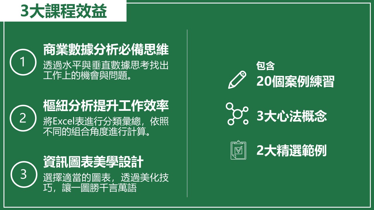 ▍上完課,你將能達到以下目標: 1. 建構有邏輯的數據分析思維,遞交報告再也不會被老闆退件。 2. 極速資料分析手法,3分鐘就做完數據分析,早早下班去。 3. 掌握基本繪圖原則與操作小技巧,讓一張圖表勝過千言萬語。 |