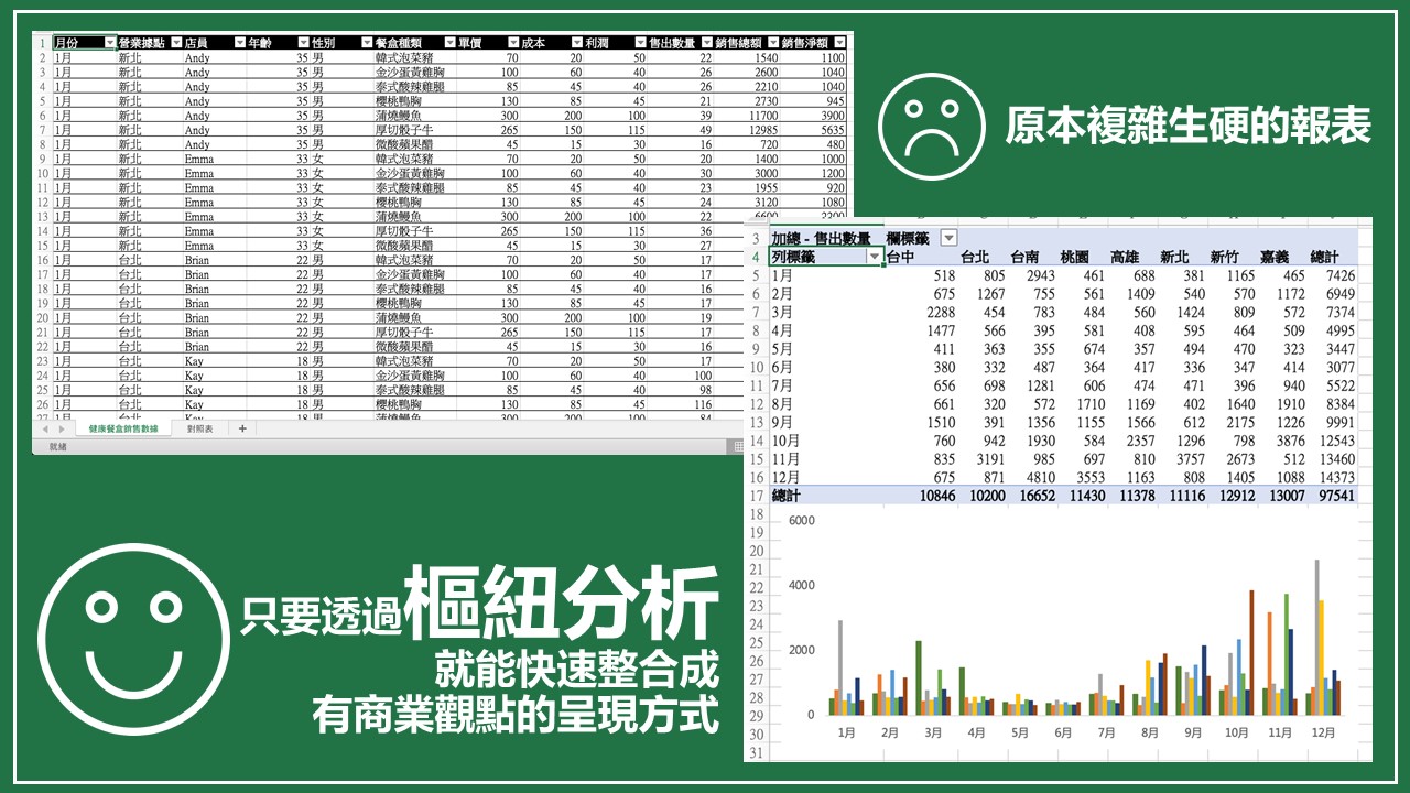 ▍每次用Excel做報表分析時,你是不是很常遭遇這些問題呢? 1. 老闆說要做數據分析,到底要分析什麼?又要怎麼分析呢? 2. 報表資料量龐大且雜亂,不易整合成精簡易讀的報表。 3. 想要利用圖表,讓資訊一目了然,卻只會基本的繪圖方式。 |