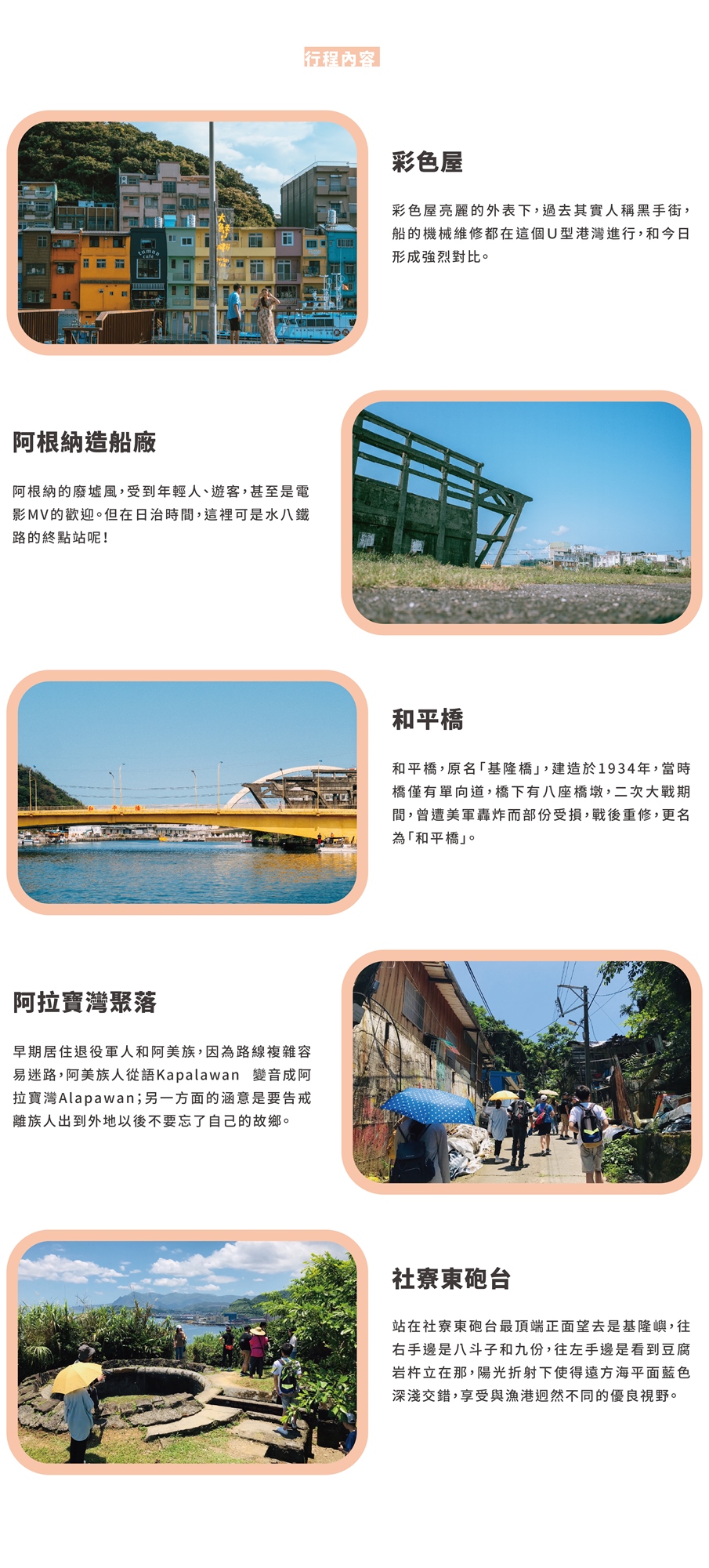 聽過和平島公園,走過海邊沿岸,那你知道和平島有一條山路,通往可以眺望基隆嶼和阿拉寶灣的基隆隱藏秘境嗎 ! 那是內行人才知道的和平島小旅行。這條山路其實是在地居民搶救之下保存的,因此得來不易,讓在地人藍媽媽為你訴說,搶救東社寮砲台的故事。另外還有許多精彩介紹,你知道西班牙人是如何尋找在地水源的嗎? 你知道阿拉寶灣曾經有聚落嗎? 你有看過被樹根纏繞的壯觀遺址嗎? 當然也不會錯過漁港邊的正濱彩色屋,以及阿根那造船廠的歷史由來喔!
