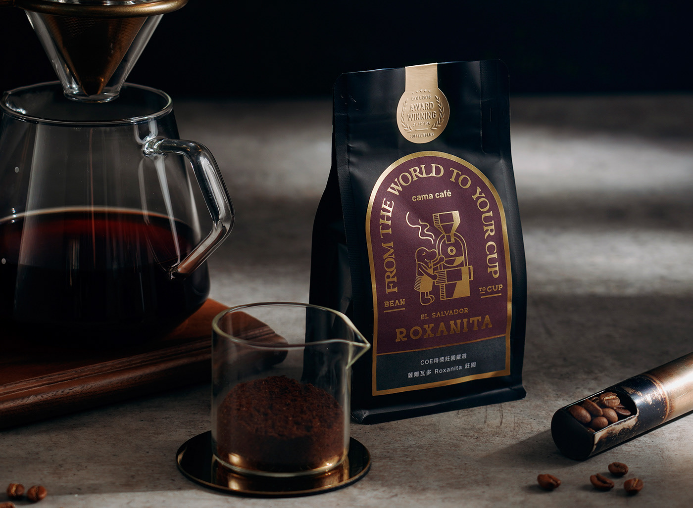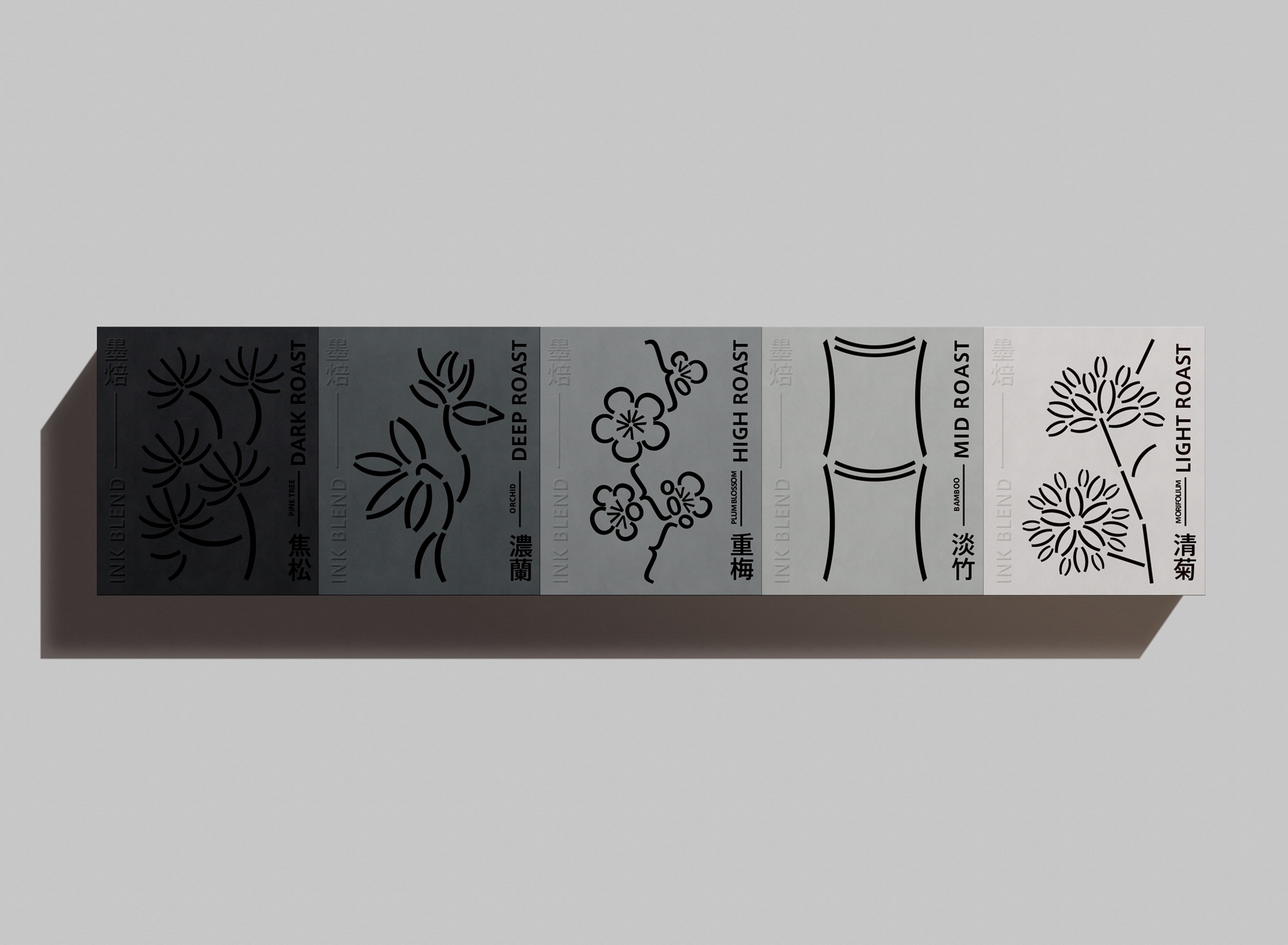 研磨、注水,萃取黑的層次與氣韻,水墨與咖啡都是品味黑的藝術。墨有「墨分五色」之說,指墨色從濃至淡的多種變化,包裝設計即以此為概念,將水墨畫中的花草題材與咖啡烘焙度及風味結合。焙有焦、濃、重、淡、清,韻有梅、蘭、竹、菊、松。