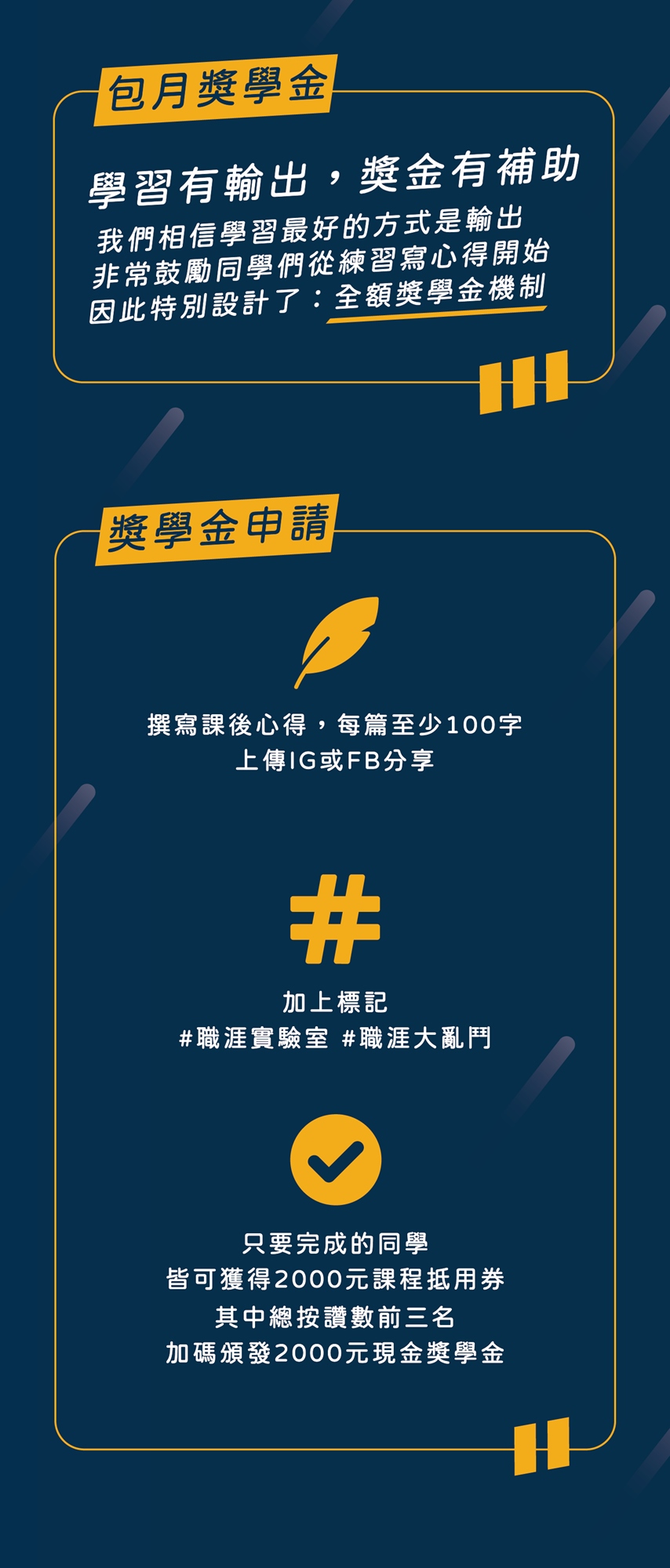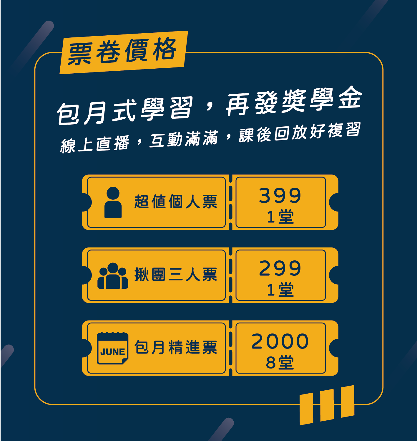A2:每堂課程都可以單獨購買,但很推薦包月學習喔,不但可直接省下1,192元,還可以申請額外的2000元獎學金。