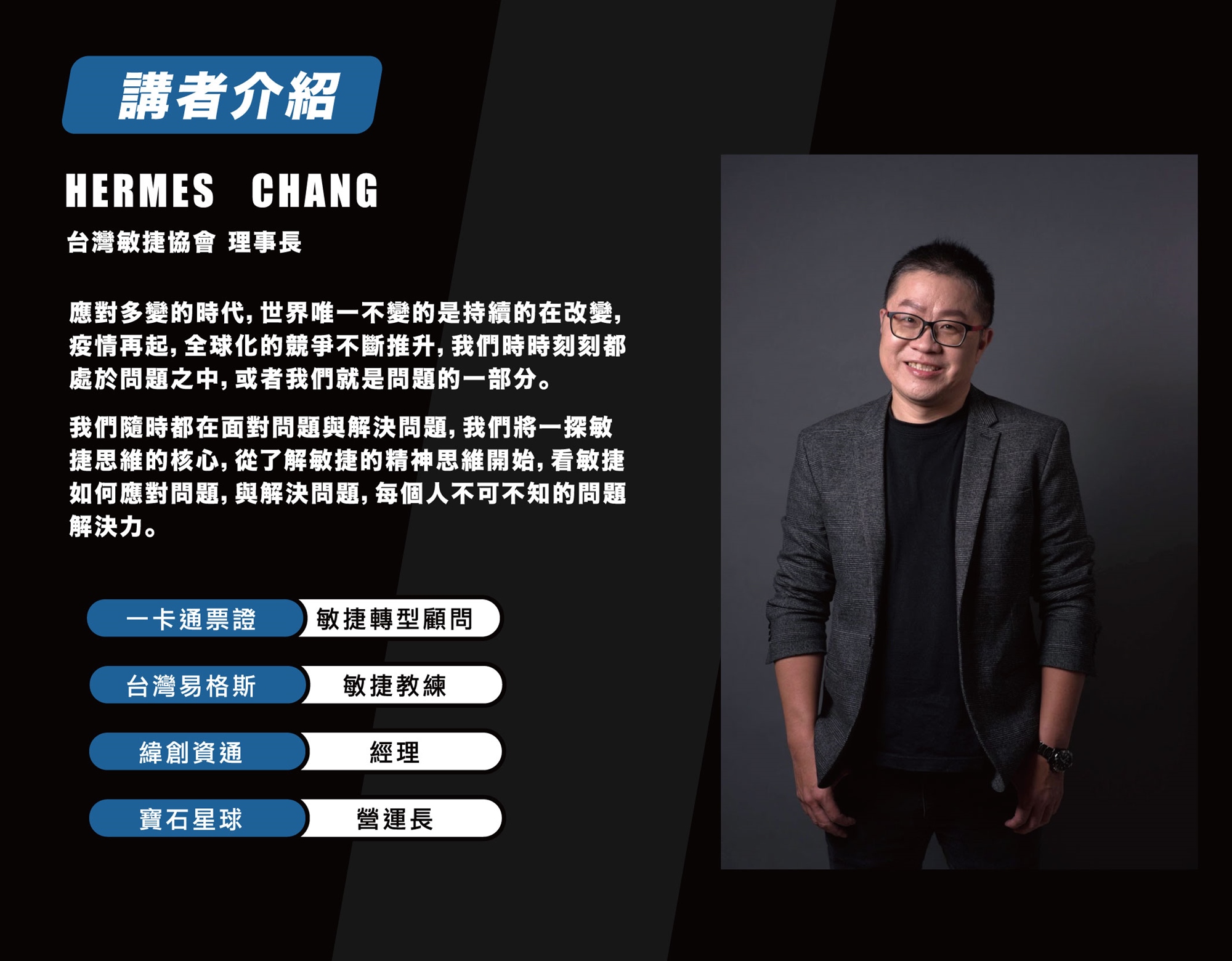 在這場講座,我們將一探敏捷思維的核心,從敏捷的精神思維開始,學習如何用敏捷思考來應對、解決問題。