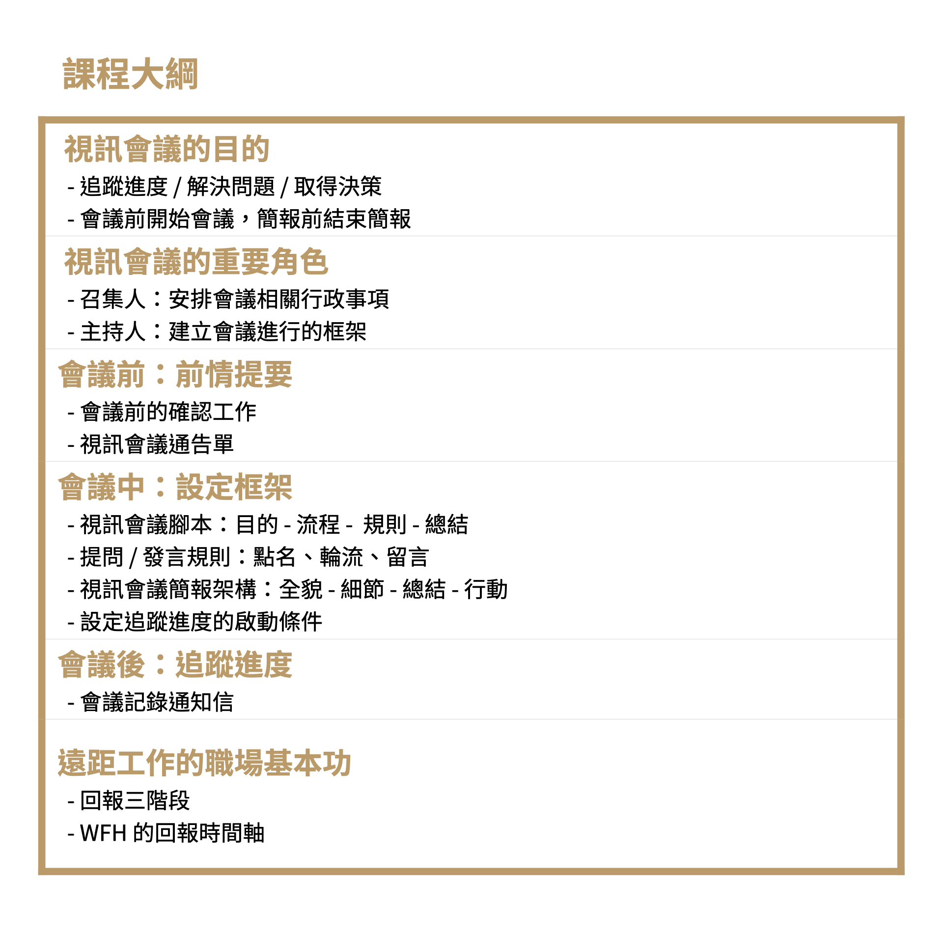 這是一門 90 分鐘的直播課程,內容會從五大面向展開細部講述,分別為「角色扮演」、「前置準備」、「簡報技巧」、「進度追蹤」、「畫面管理」,並會在課程末段由兩位講師進行對談,為您收斂「匯報重點」的落地方法及注意事項。相信您在上完課以後,能於會議前準備俱全,會議中推進順暢,會議後掌握全局,打造一場品質及效率兼備的視訊會議。