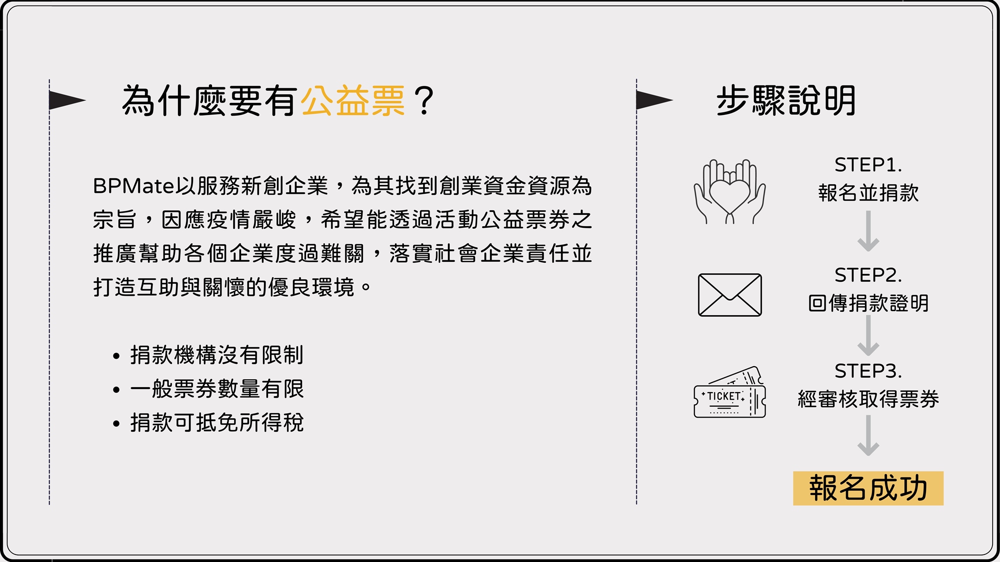 公益票:為推廣公益暨實行社會企業責任之目的,報名後會回傳任何公益機構之捐款收據(500元以上),經審核方能獲取序號,並於活動當天點入連結參加。