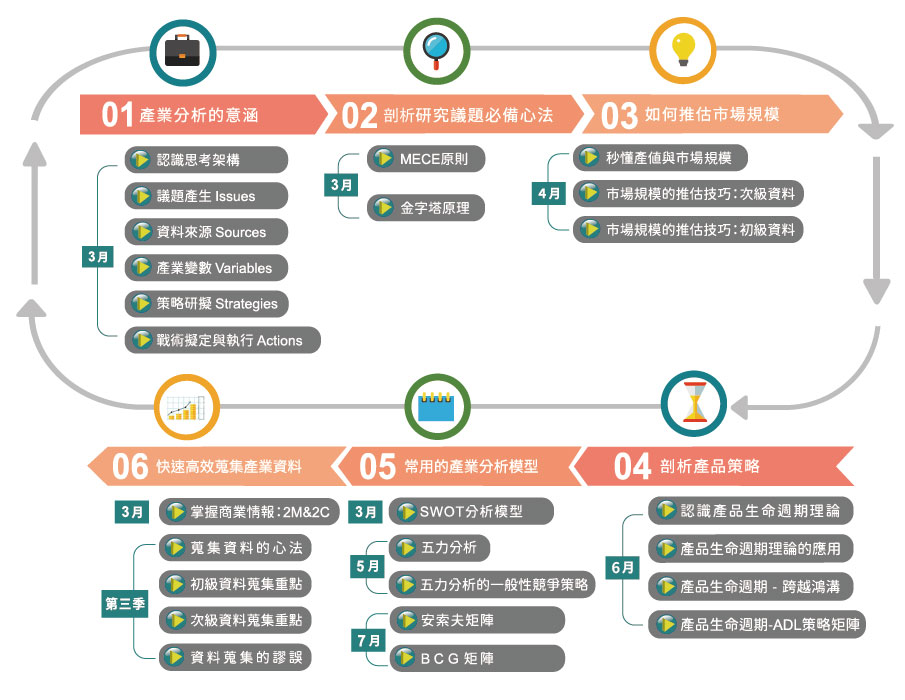 產業分析對企業所處的產業進行研究,強化個人的產業分析技能,能增進自己對所屬產業變化的認識,正確解析產業情報以掌握市場發展趨勢,對個人的職涯規劃或組織的未來發展,都會帶來正面的相互依附加值效益,產業分析技能分為「確立問題、蒐集資料、分析解讀、推論預測、觀測瞭望、呈現表達」六個知識階層,有系統的引導您進入產業分析知識學習輪,您應該將產業分析技能凝聚為個人的核心能力,先鞏固核心,再開展個人的階段性職能,面對轉職的關鍵時刻,您會更有信心的為自己做出最佳的判斷與決策。