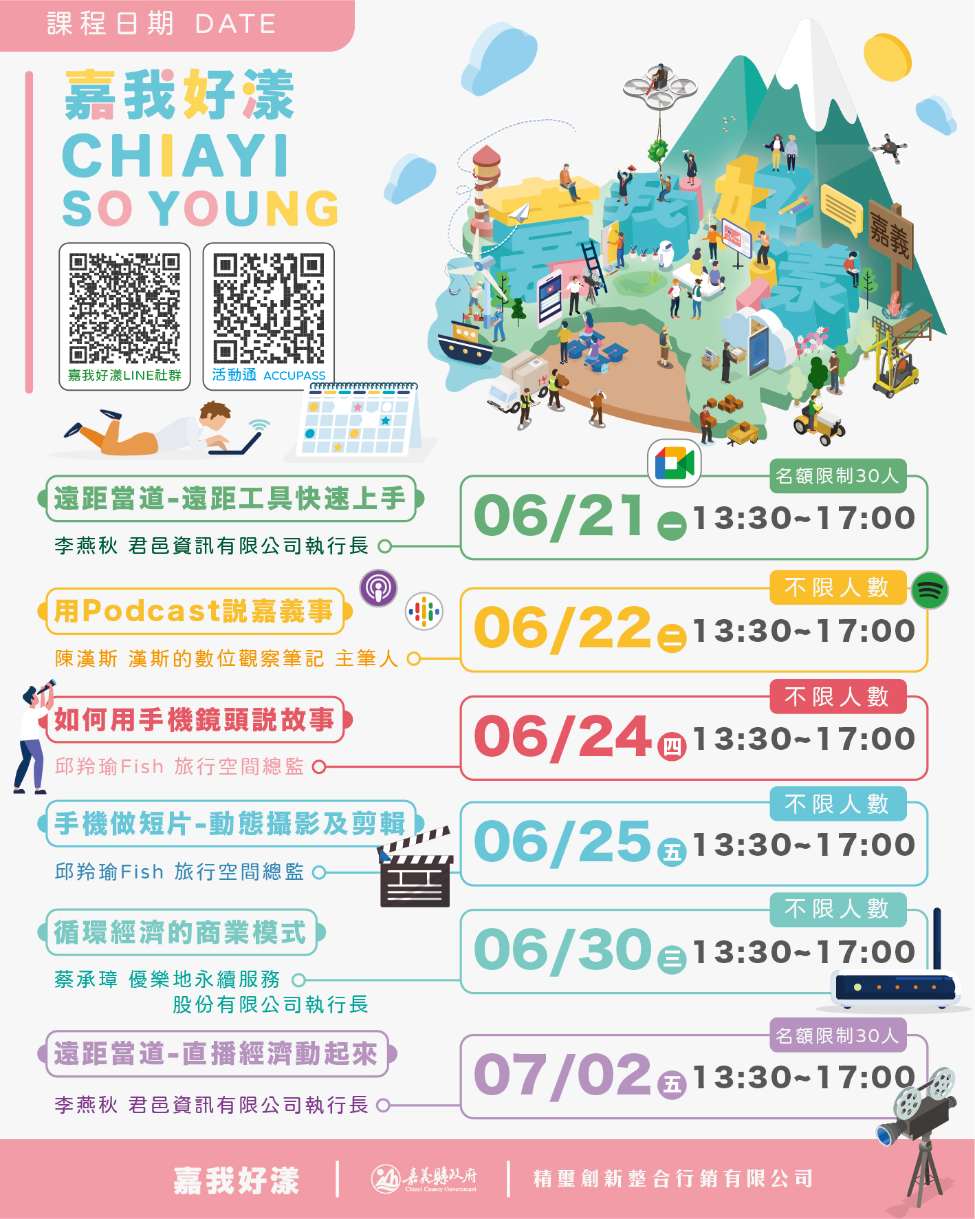 感謝大家對於「嘉我好漾」的熱情支持,目前第一階段課程報名相當踴躍,為維護講師授課與學員觀看品質,我們以Google Meet平台互動為主,輔以Youtube平台進行分流,皆透過活動通ACCUPASS報名,報名序號超過100之後則提供Youtube連結進行觀看。請學員報名後務必提前上線簽到並完成課程!