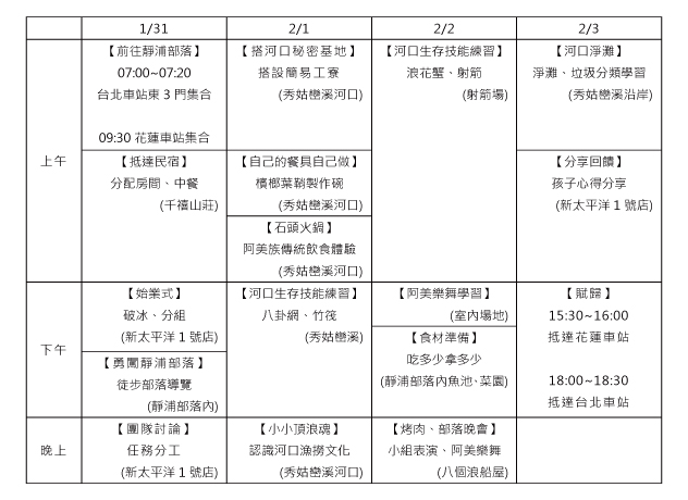 報到時間: 1/31 07:00  台北車站東3門報到時間: 1/31 09:30  花蓮車站大廳
