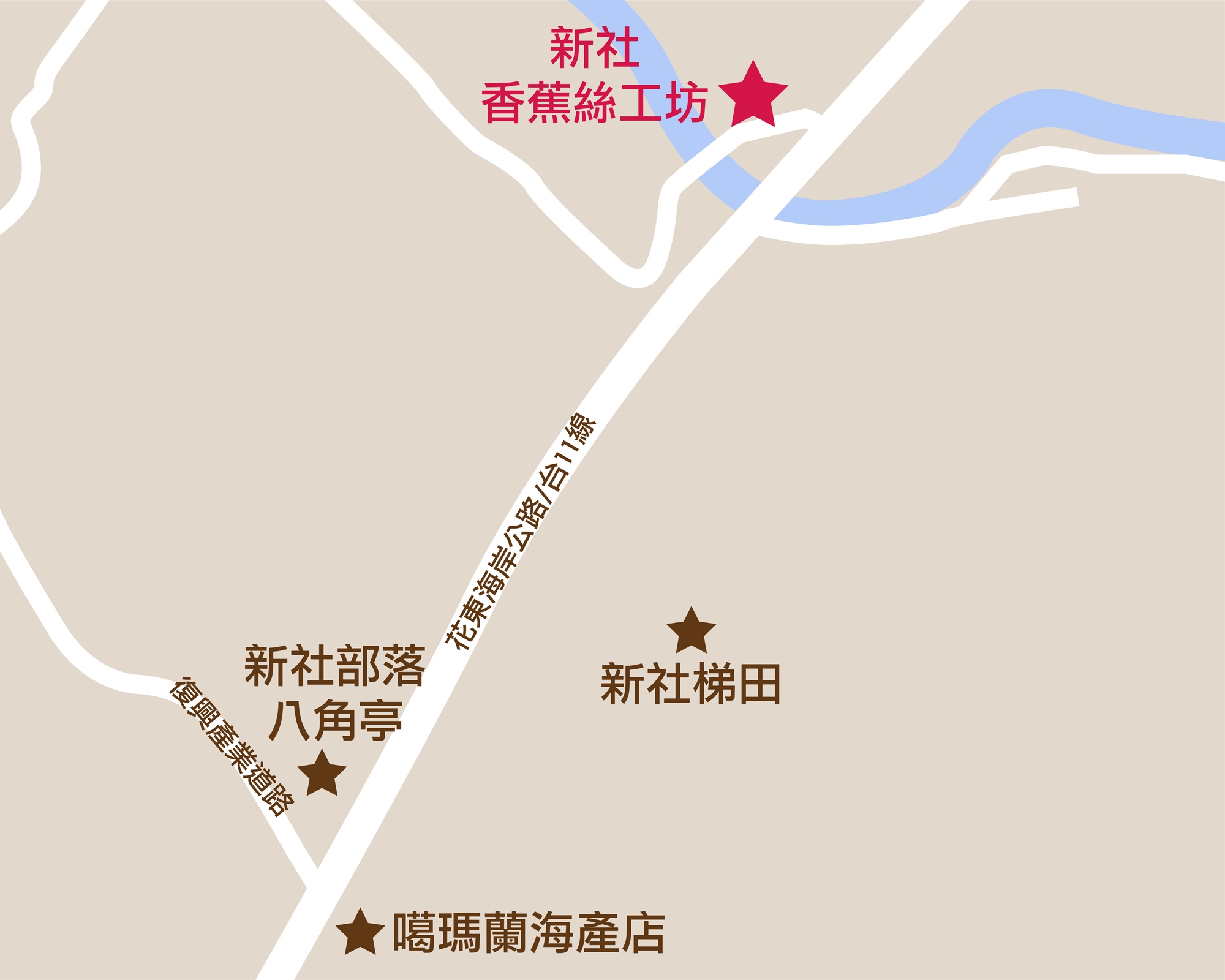 新社部落為全世界現存噶瑪蘭族文化、語言與祭典保存最完整的部落,也是全世界少數會製作香蕉絲工藝的少數民族。自祖先從宜蘭遷徙至今,百年來維持種植水稻,從無間斷。其中熱門地景「新社半島」是伸入太平洋的海階台地,居民於台地上種植水稻,成為全台最大的臨海梯田半島而著名。
