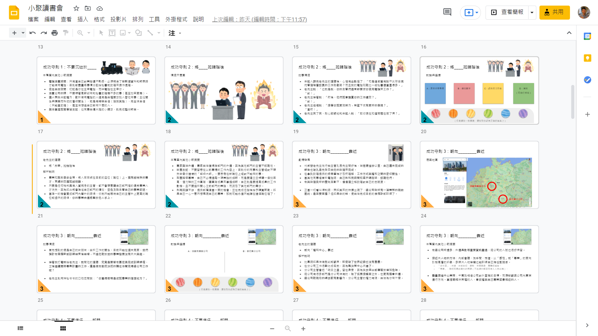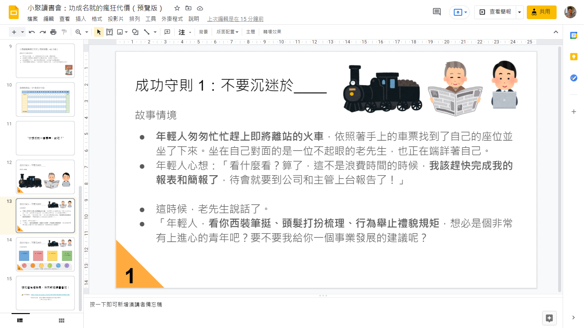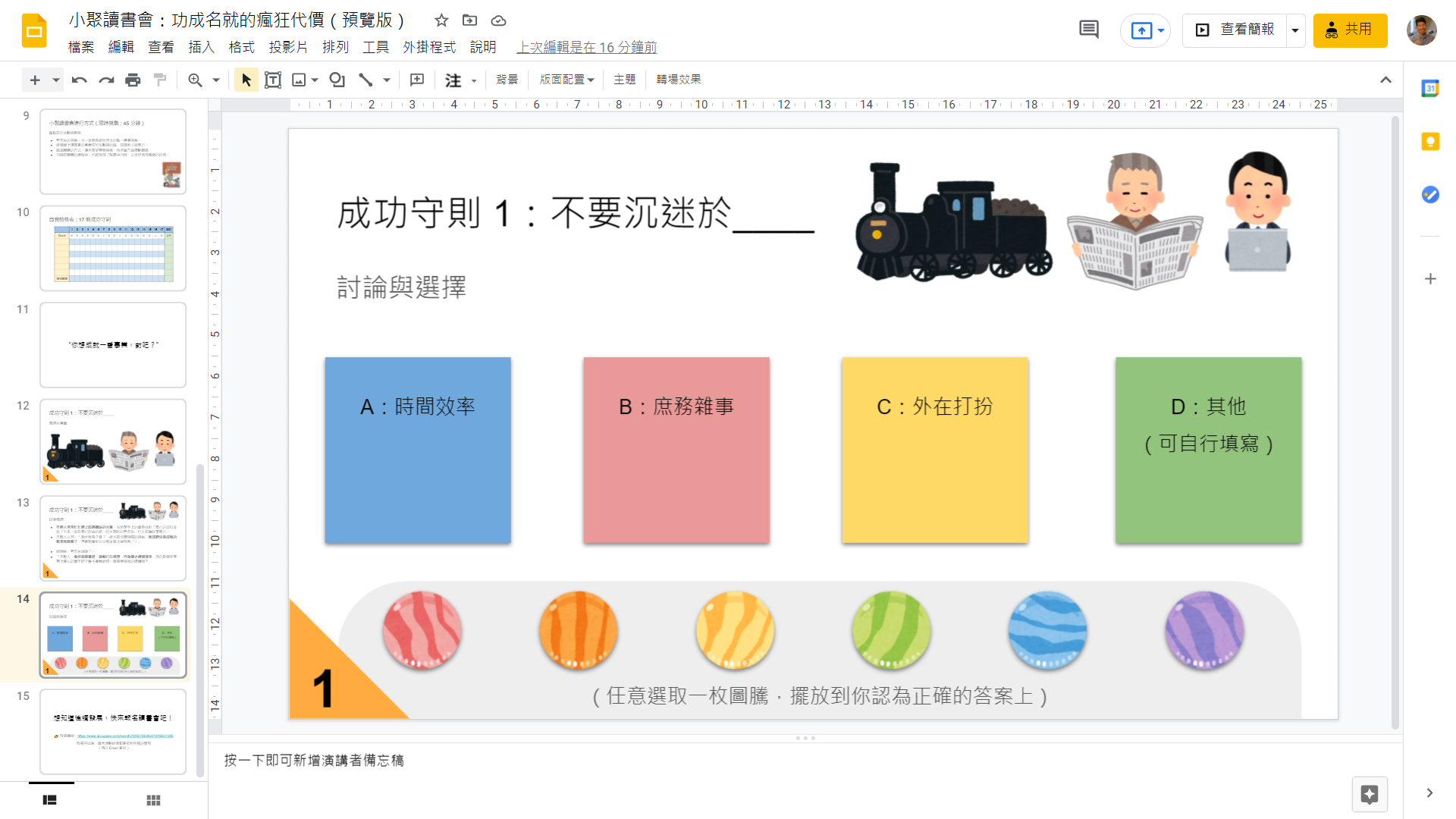 最後我們的整場活動都會搭配共編的「Google 簡報」來進行,書中一共有 17 個章節,分別會設計成 17 個關卡,每個關卡對應年輕人面臨選擇的時刻,正確答案將會是老先生的建議,因此希望讓參加者可以有互相討論的機會。