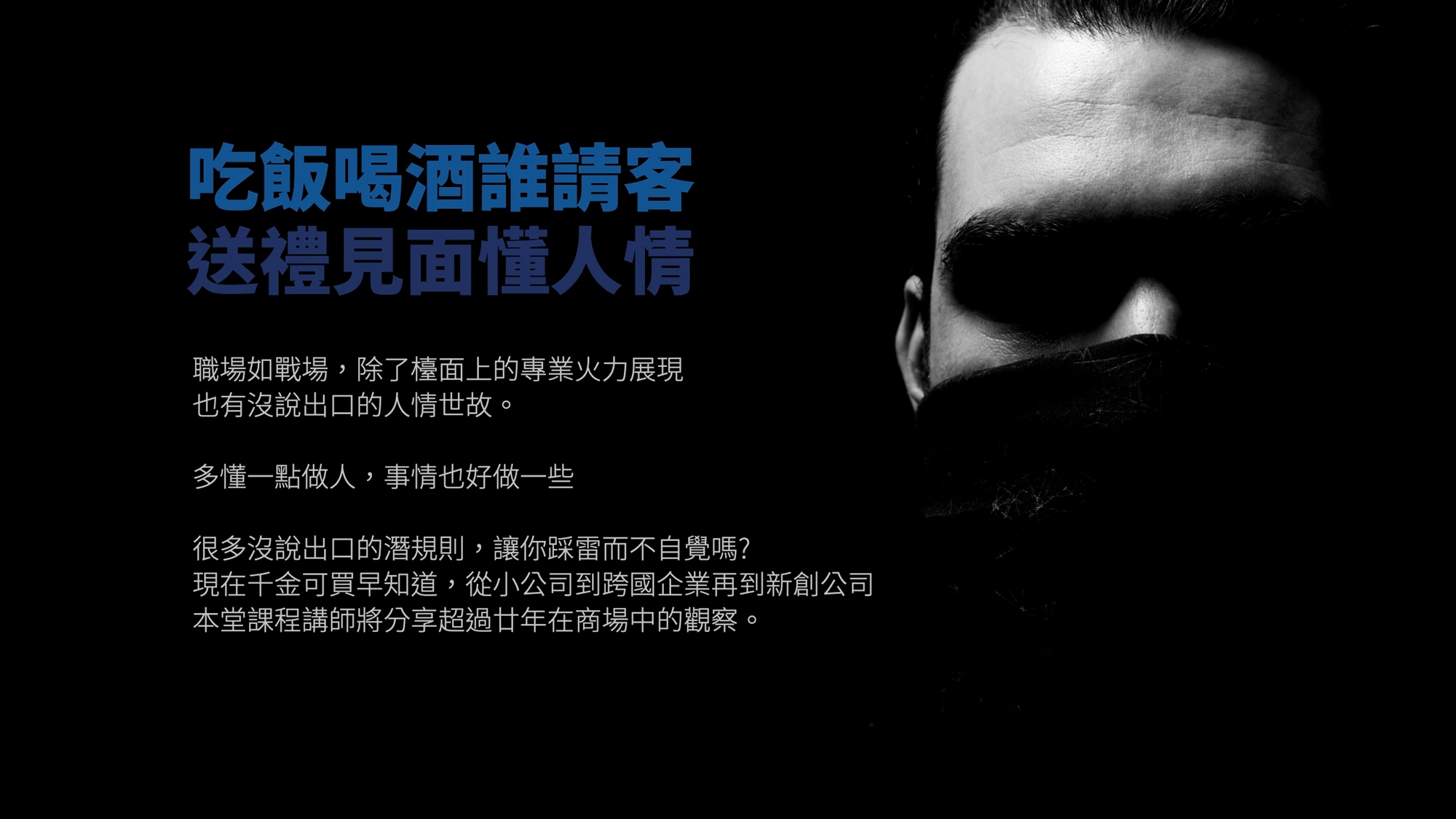 職場如戰場,除了檯面上的專業火力展現,也有沒說出口的人情世故。多懂一點做人,事情也好做一些。很多沒說出口的潛規則,讓你踩雷而不自覺嗎 ? 現在千金可買早知道,從小公司到跨國企業再到新創公司,本堂課程講師將分享超過廿年在商場中的觀察。