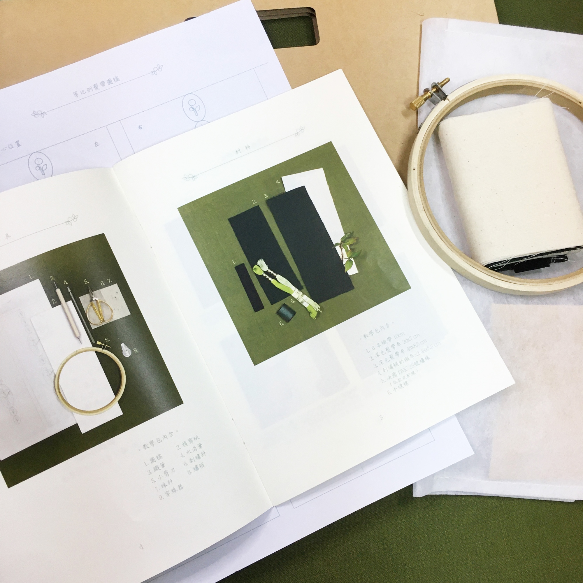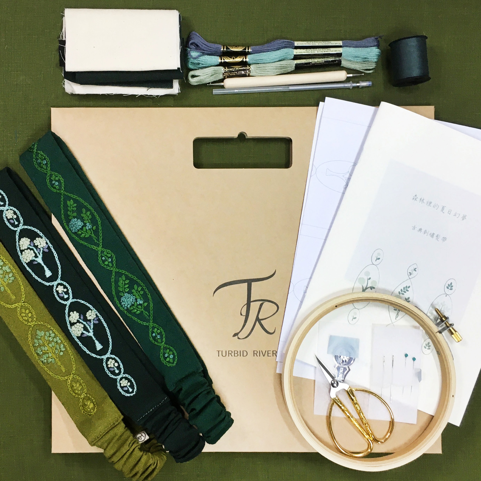 A4公文封禮盒 / DIY製作講義小書冊 / 繡框 / 小金剪刀 / 法國DMC繡線 / 手縫線 / 針線組 / 髮帶布料材料組 / 圖稿 / 轉印紙 / 水消筆 / 轉印圖案用鐵筆 / 穿線器 / 收納袋。