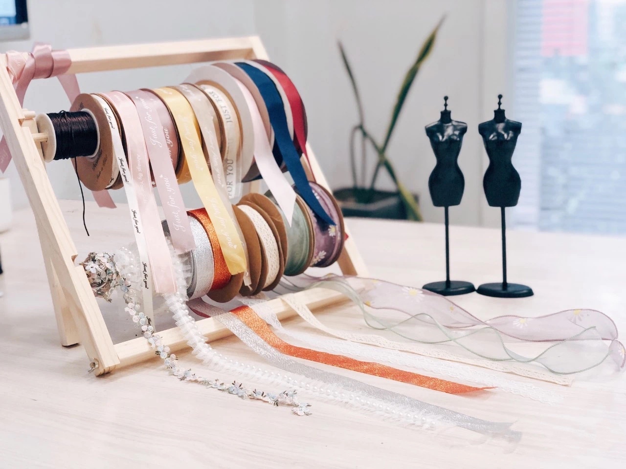 材料內容|小人形模特(黑、白隨機)、各種布料、針線、緞帶、裝飾物、設計圖紙