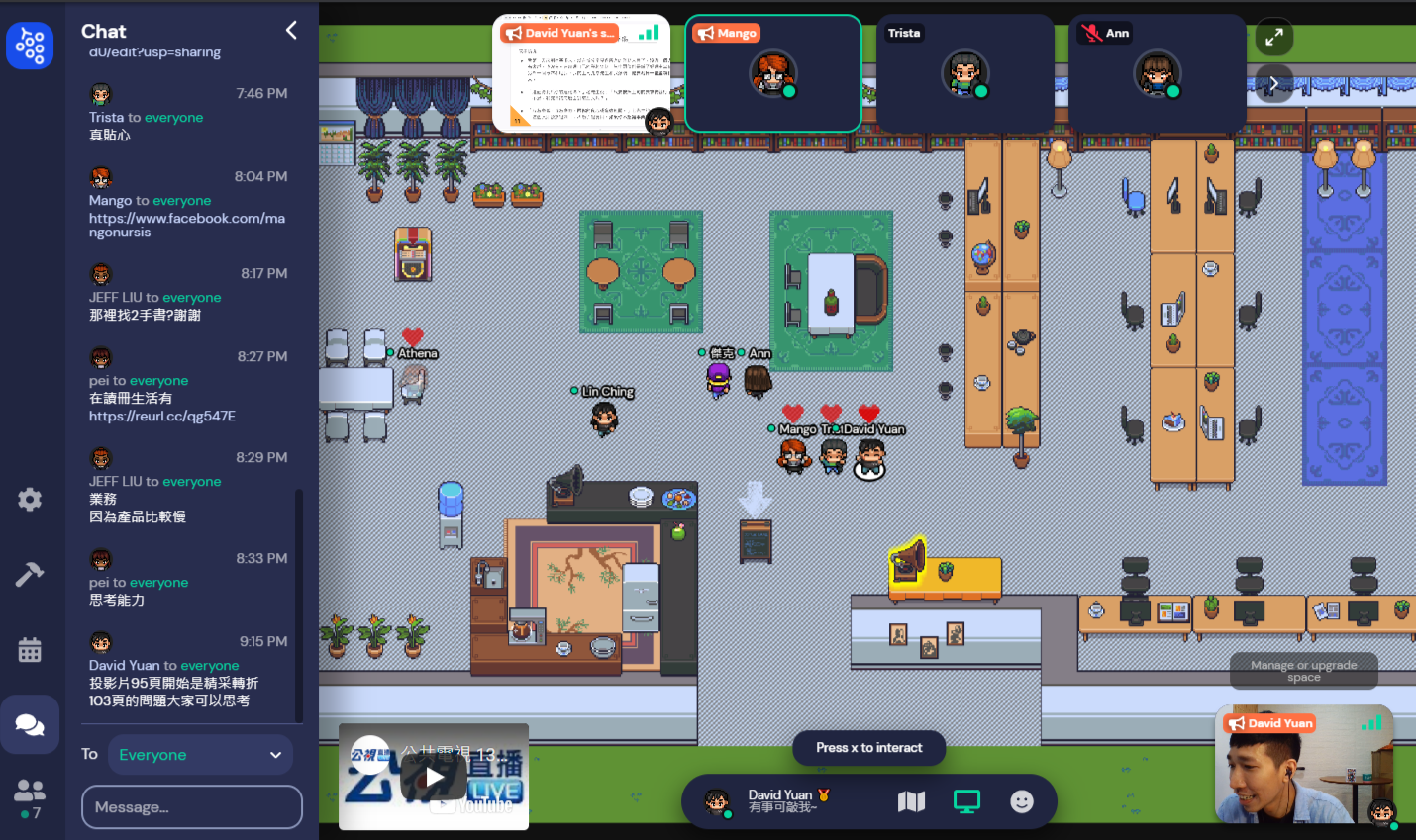 Gather Town 是一款仿造虛擬空間場景的視訊軟體,有別於一般的視訊會議軟體,它最大的特色是,每個參與者都會有專屬的「小人物」會出現在地圖上,可以實際看到自己角色出現畫面上,讓「線上聚會」這件事更有真實感與代入感!