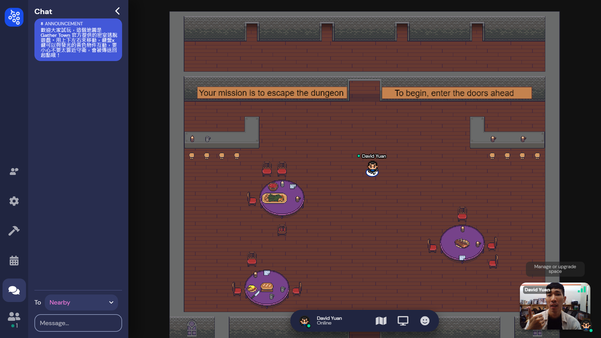 這次我們要玩的是 Gather Town 官方所推出的「Dungeon Escape(地城逃脫)」遊戲地圖,地圖的連結在這邊:https://gather.town/i/Nk2AnFEF,有興趣的話也可先行進入、稍微試玩看看。