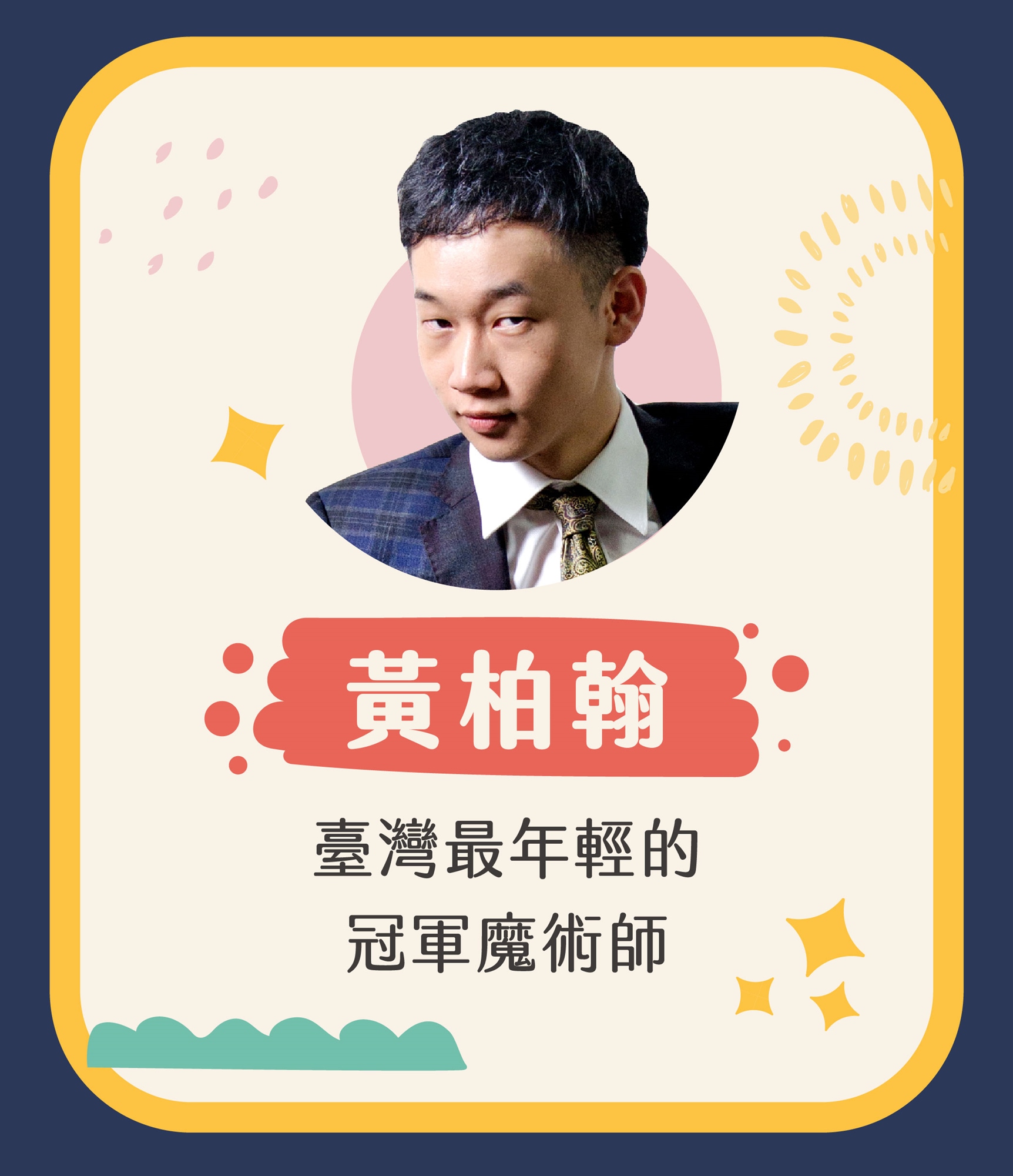 畢業於台灣⼤學,也是台灣最年輕的魔術冠軍,魔術資歷 14年,他獨樹⼀幟的表演風格,與幽默的互動⽅式,帶給觀眾華麗的視覺饗宴。