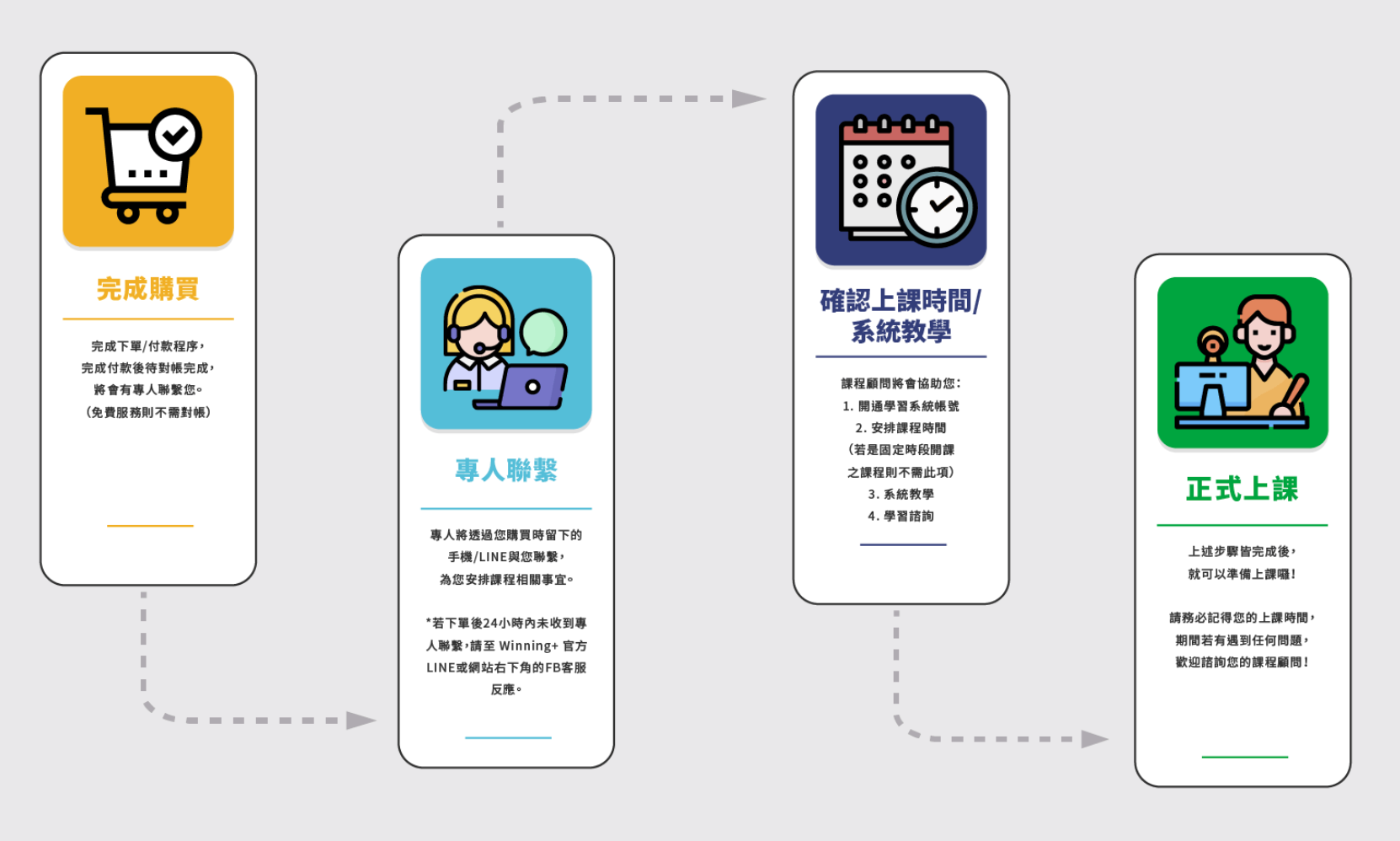 A:您成功付款後,Winning+將有專人聯繫您。課程規劃顧問為您安排後續課程(包含學習系統說明、課程軟體教學、帳號開通、課程時間安排等)。
