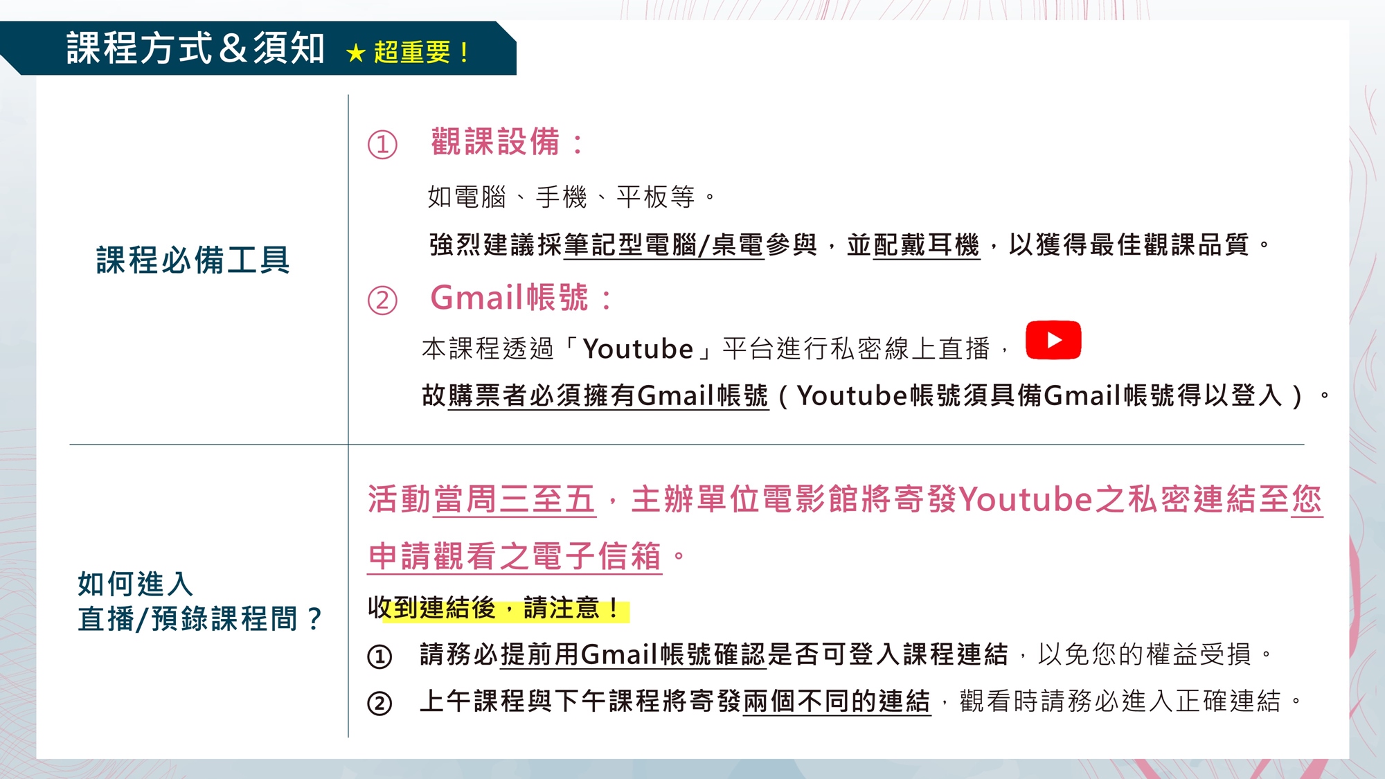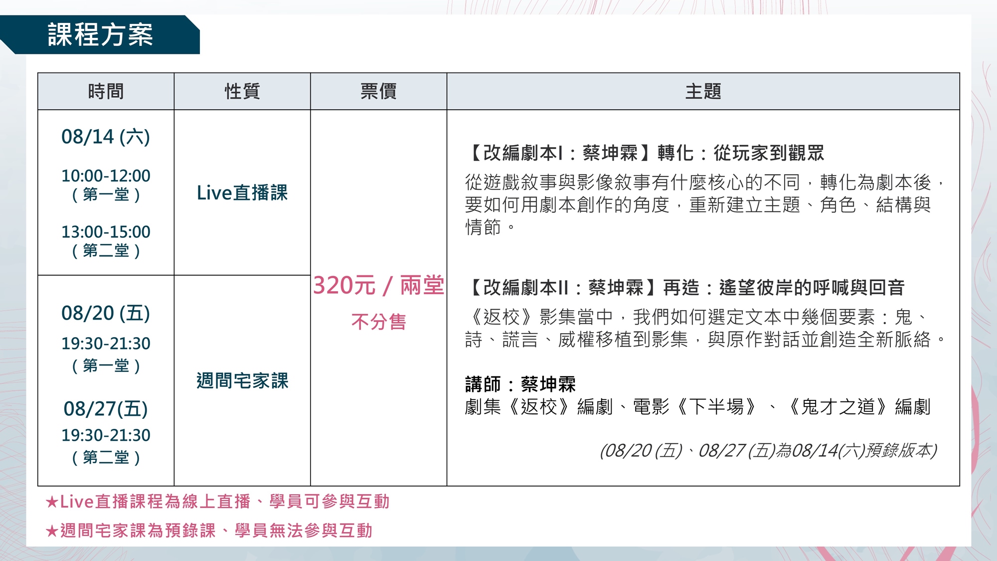 - 8/14(六) 為線上Live直播課程,同時開放學員互動。