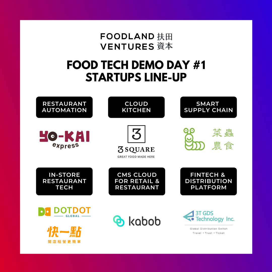 Foodland Ventures 邀請專注於餐飲科技的新創團隊 3 SQUARE、3T GDS Technology Inc、點點全球 DOTDOT GLOBAL/ 快一點智慧餐飲 QuickClick、KABOB 串串新零售雲、菜蟲農食 Tsaitung Agriculture、Yo-Kai Express 上台 Pitch 發表。同時邀請紅杉資本 Sequoia India、SOSV、Scrum Ventures 國際知名創投以爐邊會談方式,分享全球餐飲科技創新與投資趨勢。