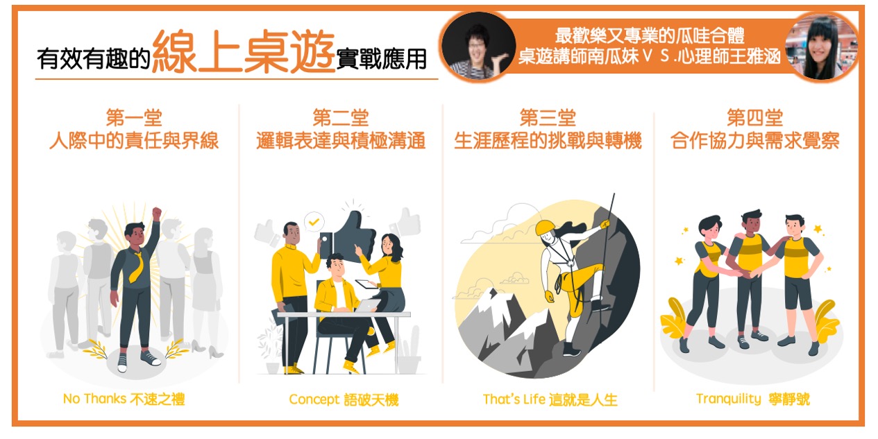 精選四大主題,十套可即刻運用的線上桌遊,拆解並示範如何結合跨領域教學、扣連經驗探索、團隊建立、自我肯定等核心議題