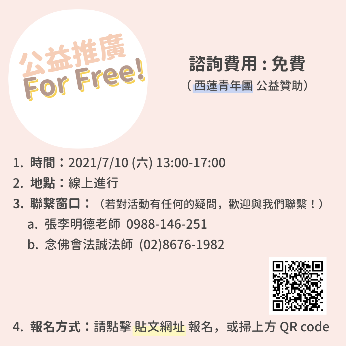 報名名額有限,如果已額滿,歡迎追蹤我們,獲得第一手的資訊;也歡迎直接私訊我們詢問是否還有額外的免費諮詢名額,請點擊:FB 粉絲專頁 / Line 學員群組(請使用手機開啟)