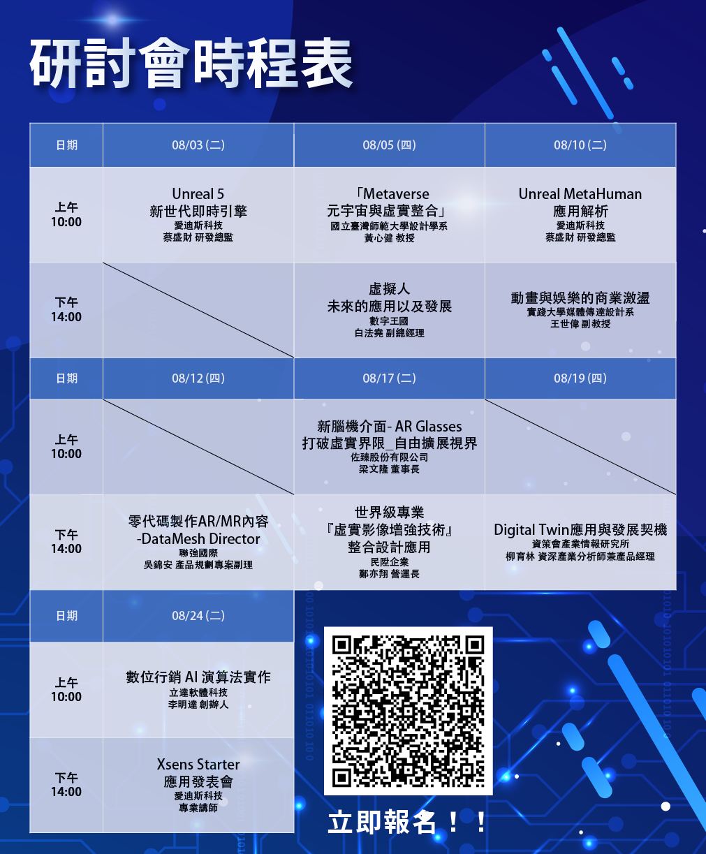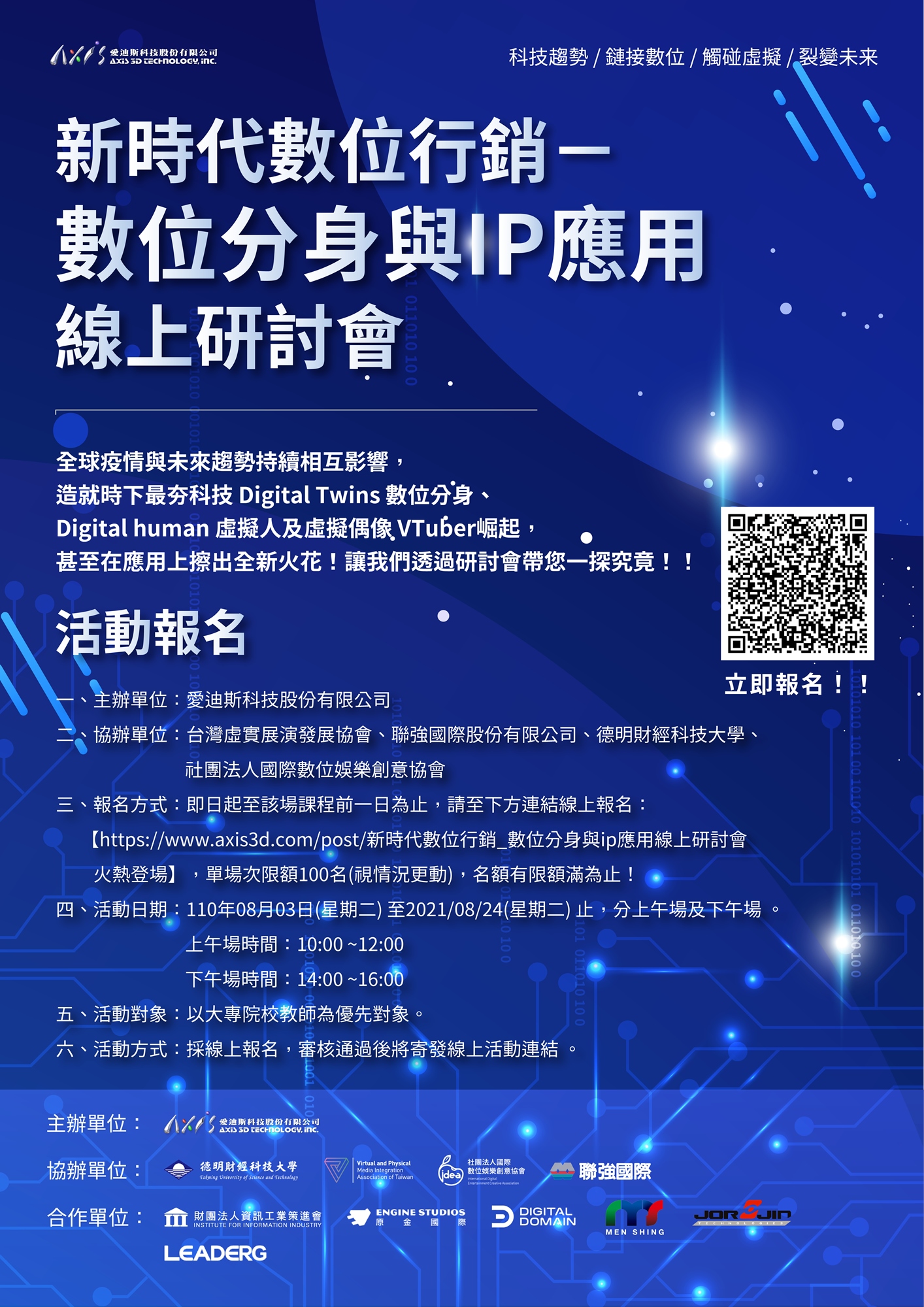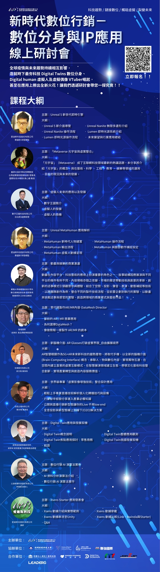 全球疫情與未來趨勢持續相互影響,造就時下最夯科技 Digital Twins 數位分身、Digital human 虛擬人及虛擬偶像 VTuber等眾多IP崛起,在行銷應用上也伴隨軟硬體日新月異擦出全新火花!讓我們透過研討會帶您一探究竟吧!!