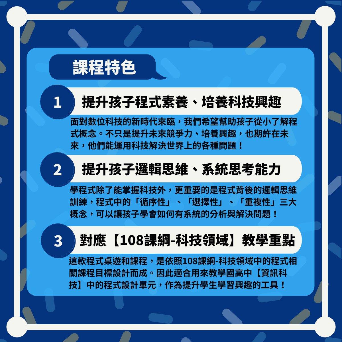 這款程式桌遊和課程,是依照108課綱-科技領域中的程式相關課程目標設計而成。因此適合用來教學國高中【資訊科技】中的程式設計單元,作為提升學生學習興趣的工具!